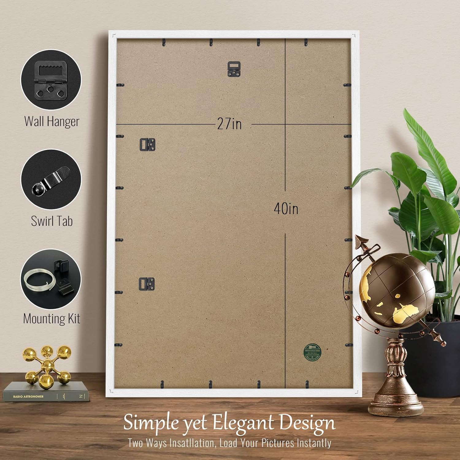 - PRODUCT FEATURES: The overall size is 41.8βx28.8β for Pictures 27x40 or 40x27, horizontal/vertical for table or wall display. Unlike others, special swirl tabs make the frame super easy to load pictures.