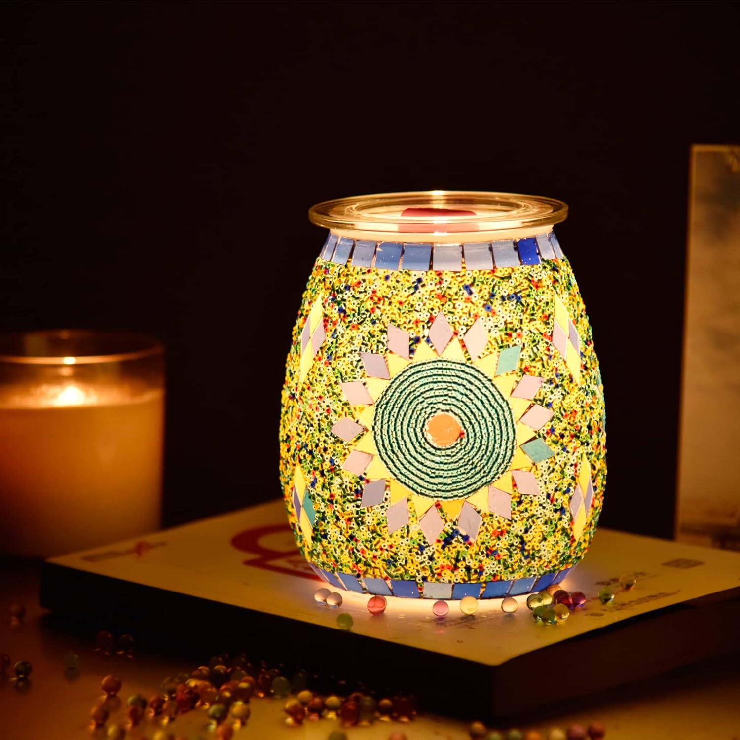 - Warm night light: When the wax melting machine is lit, the built-in light source and the color of the Mosaic material are set off each other, forming a colorful visual effect, creating a warm and romantic atmosphere, adding a color and fun to your life.