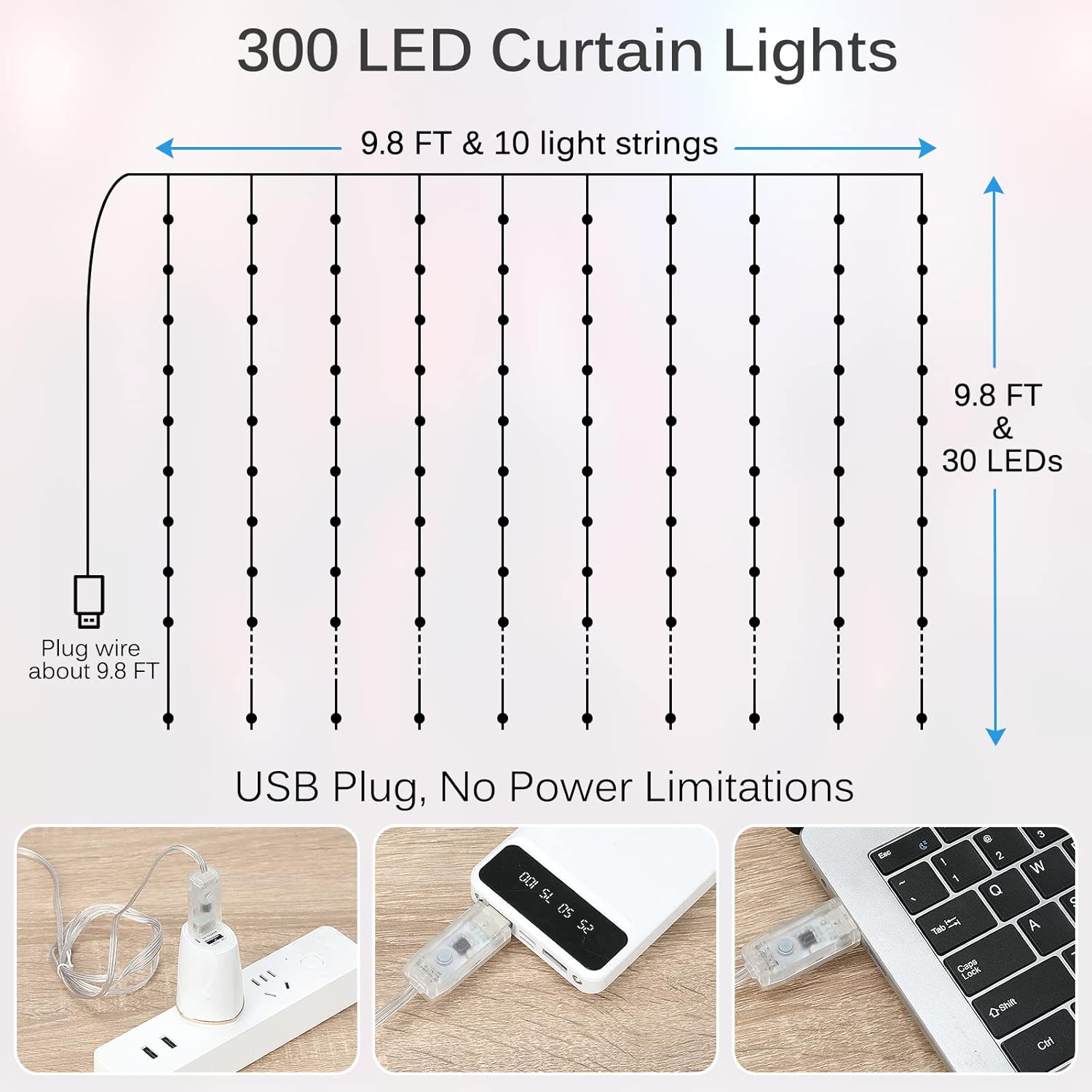 - Safe & Easy to Install: USB power means you can use window curtain lights anywhere, indoors and outdoors,plug in various USB power output device,such as USB charger, powerbank, laptop etc; With 10 equipped hooks, simple to hang it on any surface.