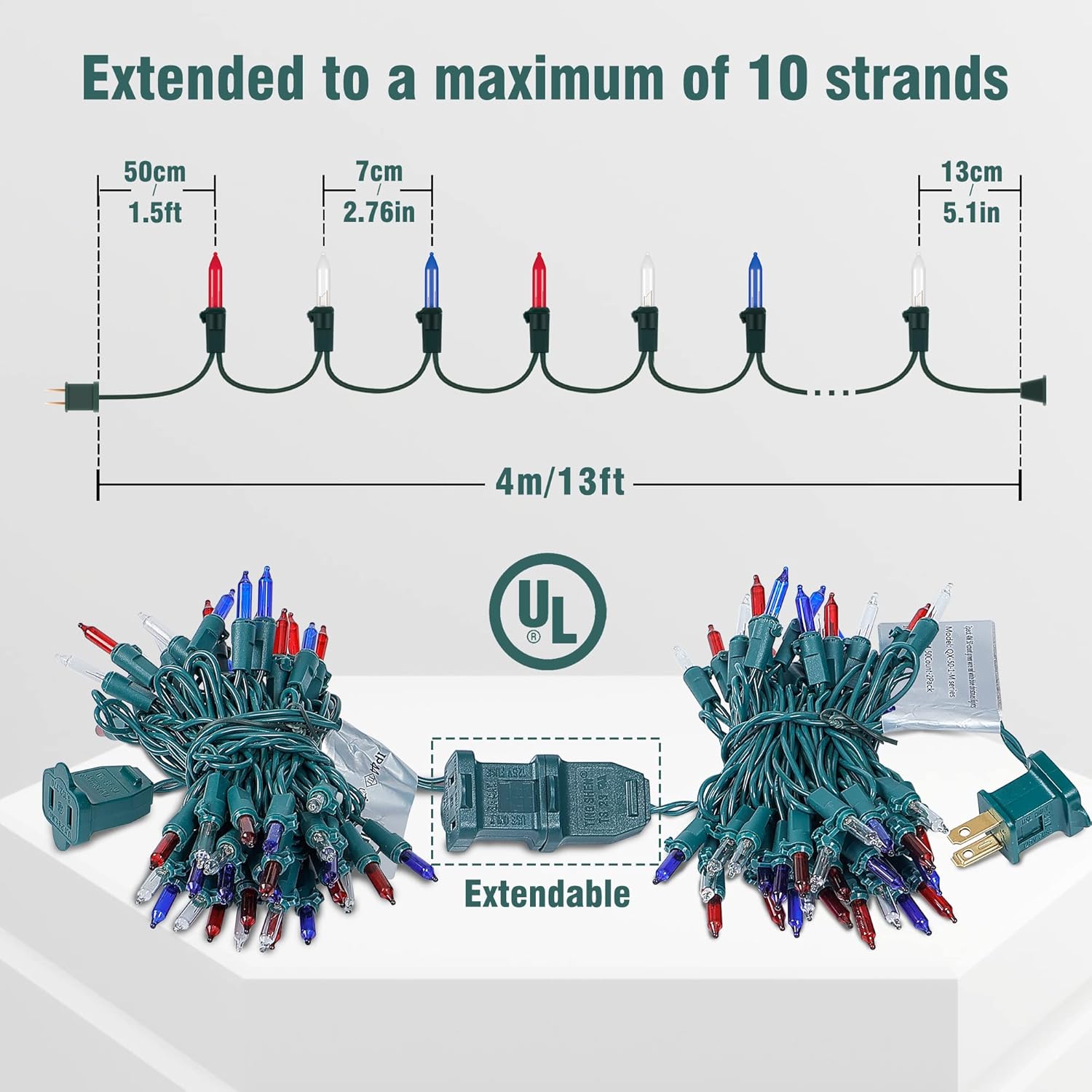 - 100 Count Patrotic Mini String Lights:2 Packs green wire 50count old-fashion incandescent red white blue lights,13ft per strand,2.76inch spacing,1.5ft lead,5.1inch tail.The romantic festivel atmosphere at night to make your home a wonderful sight for your neighbors.