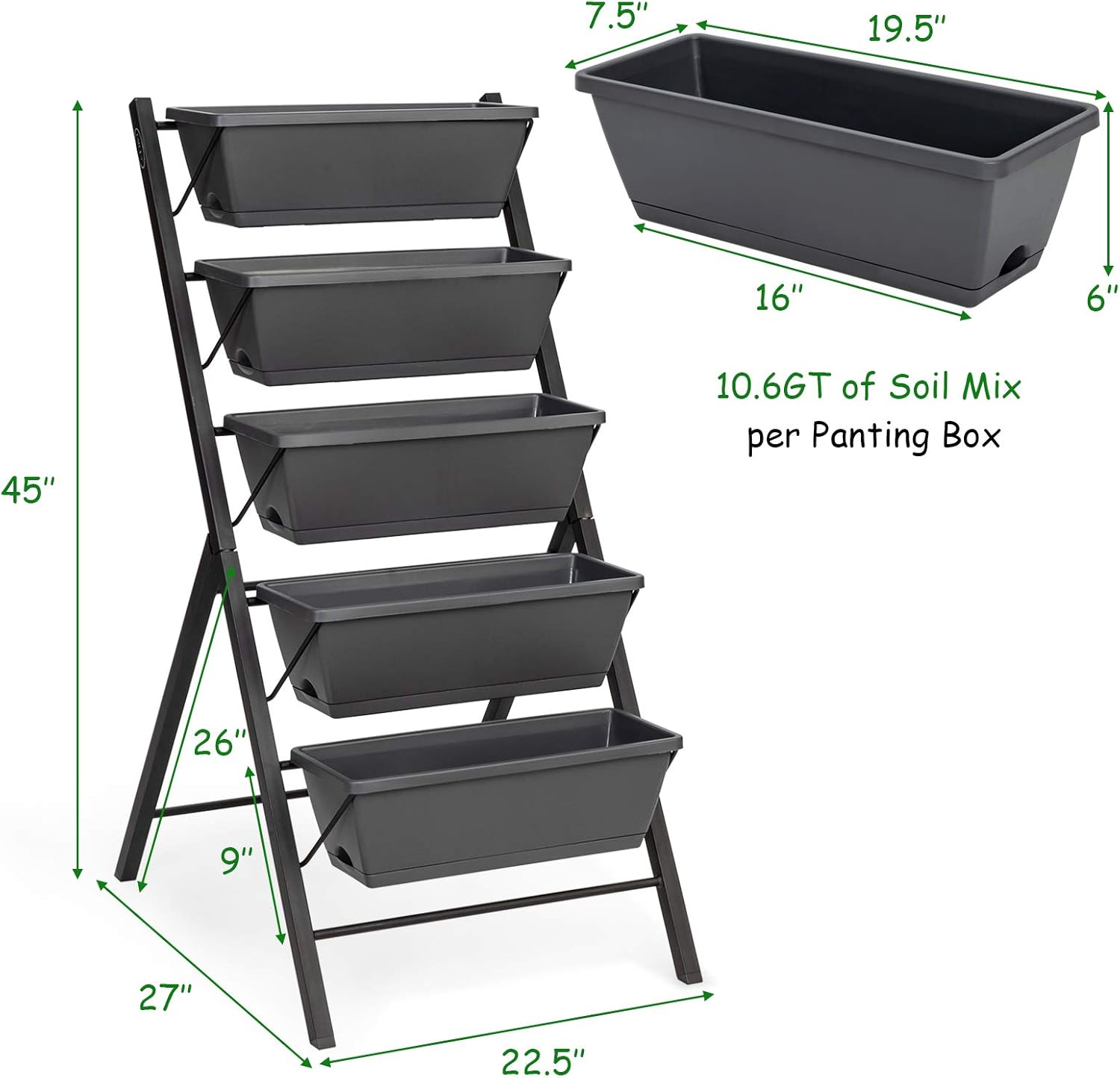 - ☘️【Sufficient Planting Space】 Equipped with 5 PP made container boxes, each box can contain 0.5 cubic feet volume of soil and hold up to 22lbs, which can provides you with sufficient space to grow vegetables, flowers, fruits, herbs, etc.