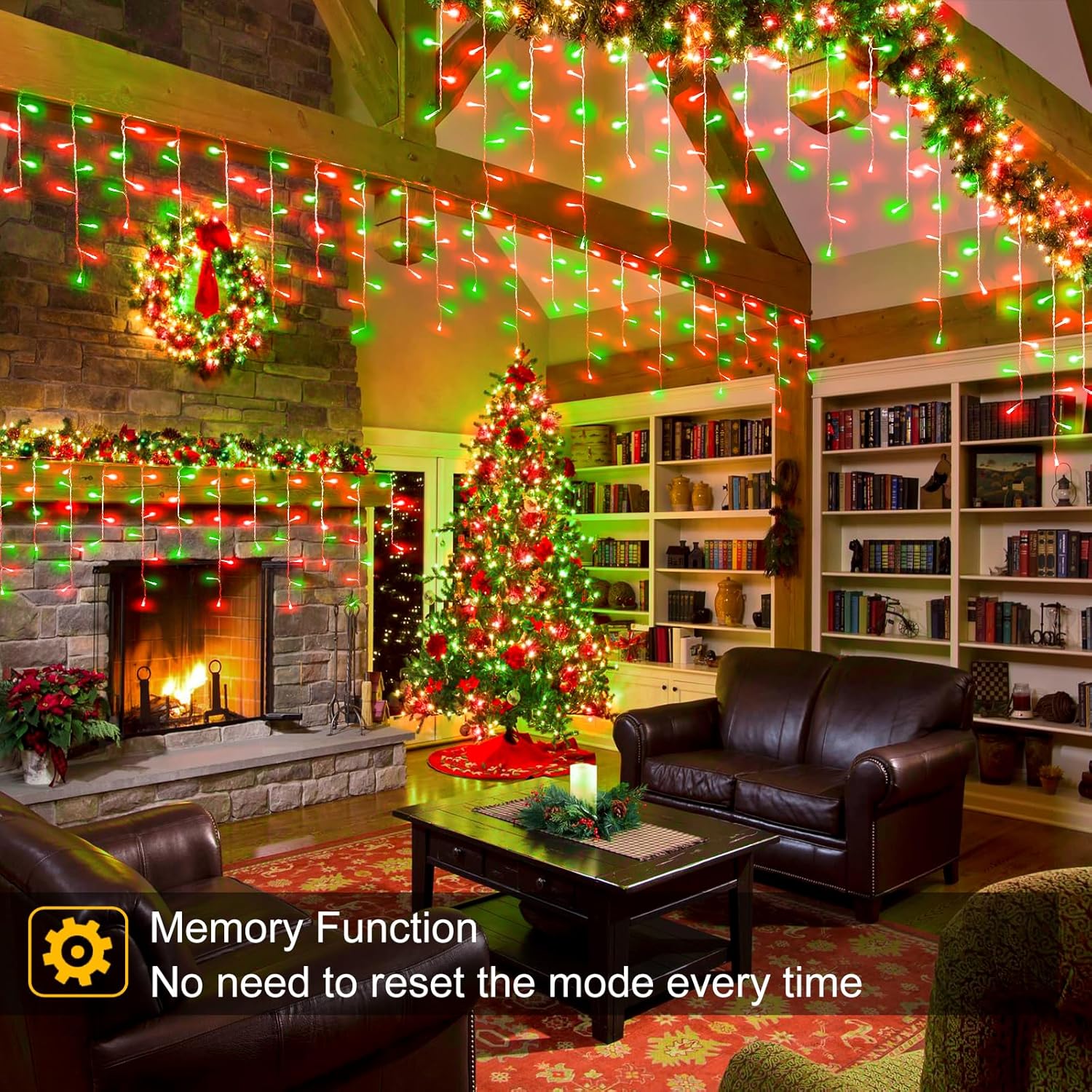- Upgraded 8 Modes Red and Green Christmas Lights: The icicle Lights for outside have 8 selections of light pattern: 1.Combination 2.In Waves 3.Sequential 4.Slo-Glo 5.Chasing/Flash 6.Slow Fade 7.Twinkle/Flash 8.Steady On. Different lighting effects are controlled by the button on the plug. These beautiful and vibrant Christmas lights outdoor will bring you a lot of festive atmosphere.