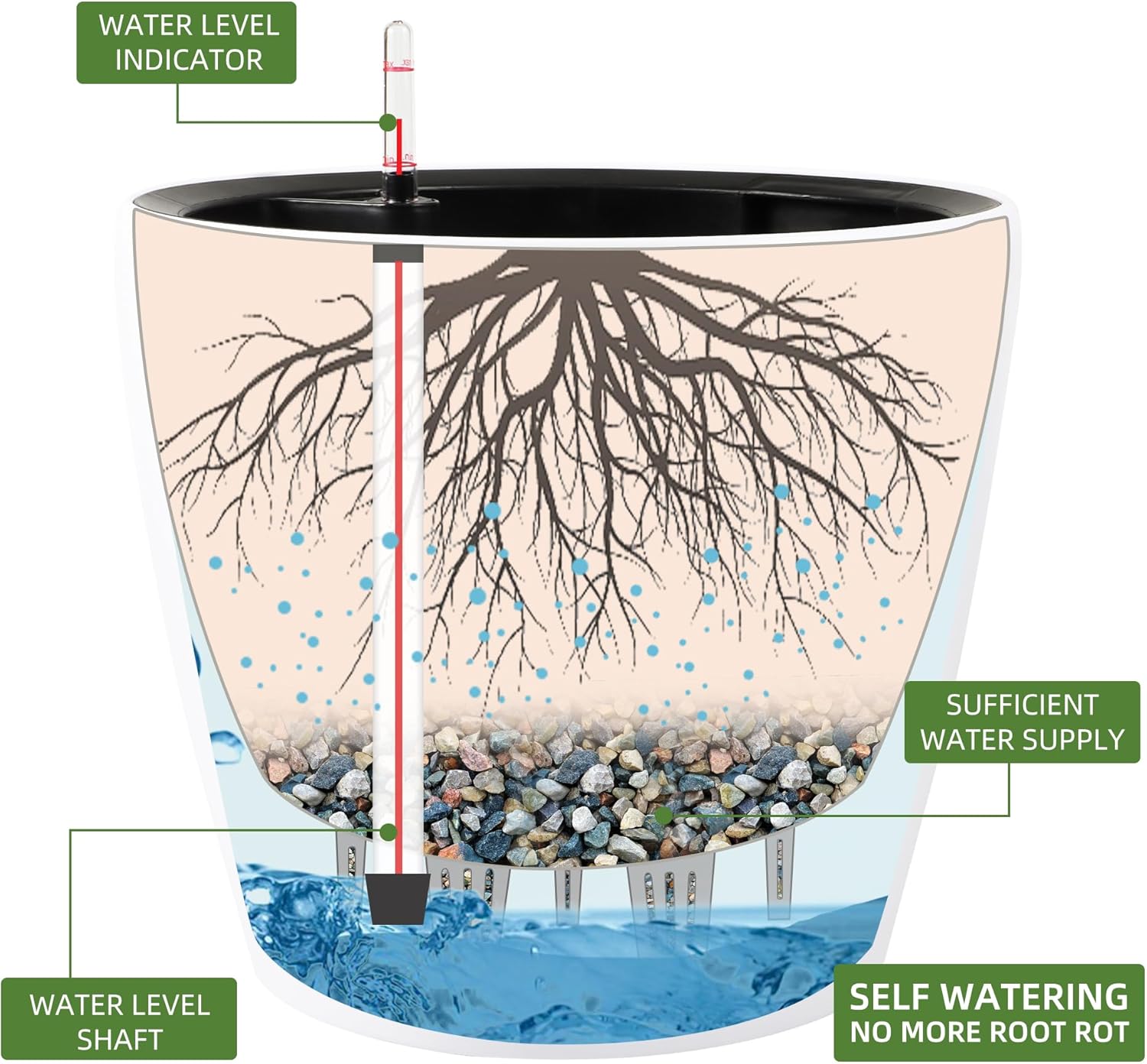 - NEVER MISS WATERING AGAIN - The hydroponic device keeps water ready, then watering time is at your discretion on the gauge. The design of drainage plug and spillway hole is to avoid cycles of overwatering and underwatering, pull out the plug to drain the excess water on rainy days outdoors. The sufficient water supply system enables double the water-efficient than conventional pots. Don't be anxious about missing watering while you enjoy a long term holiday on a journey or travel outside
