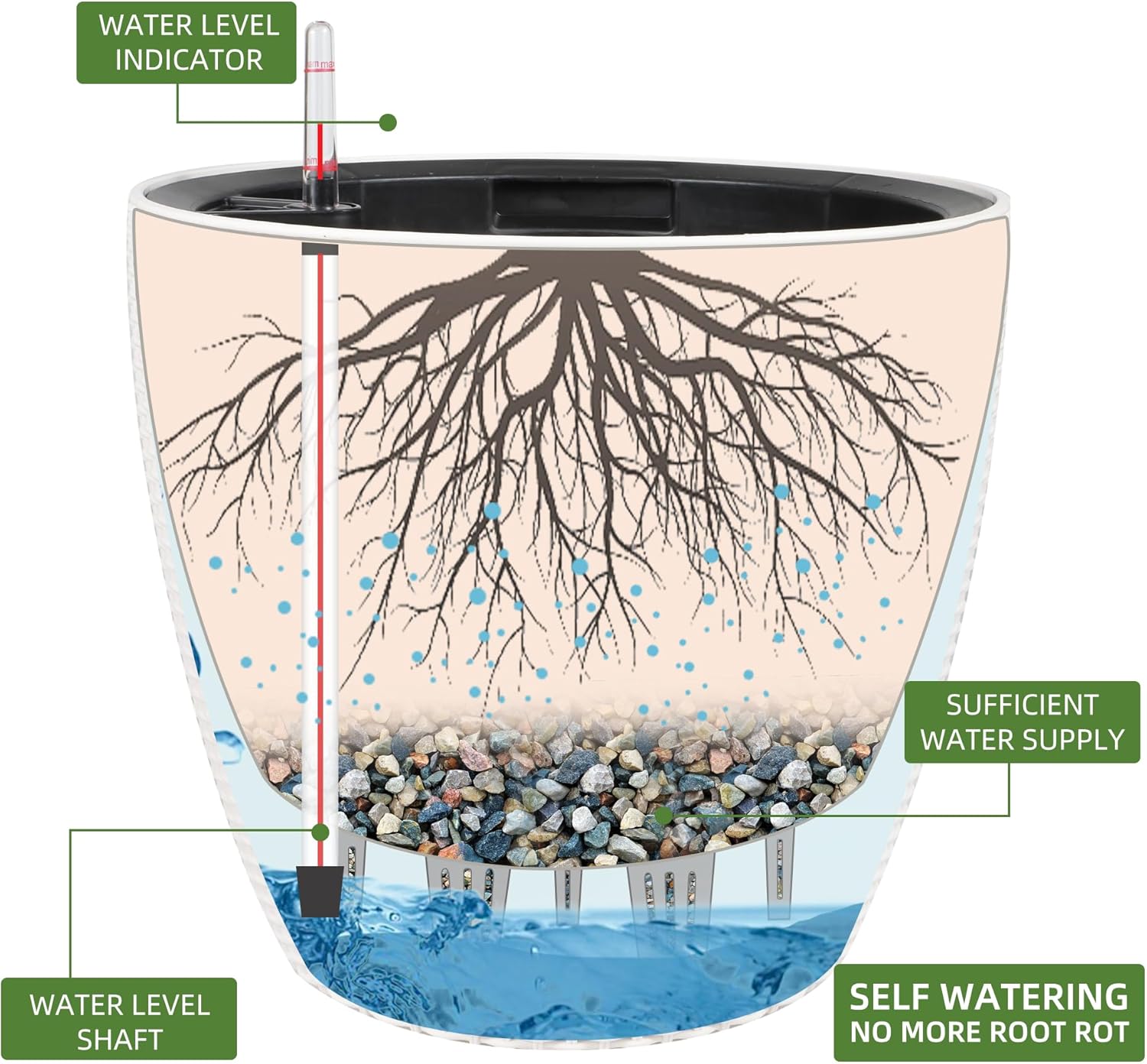 - Self Watering System: The integrated water reservoir keeps soil moist and aerated for optimal plant growth.