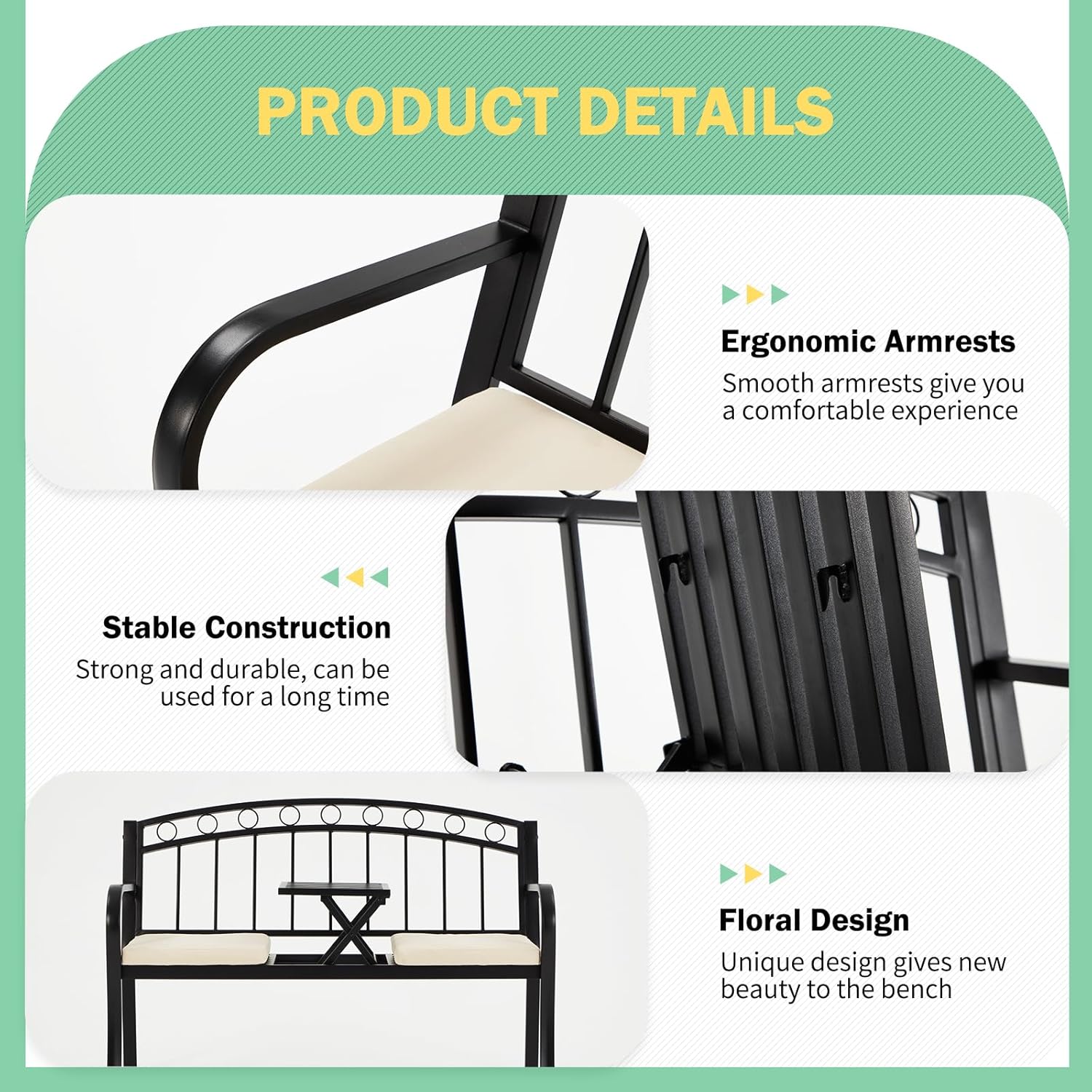 AVAWING Outdoor Metal Garden Bench, 2-Seat Patio Porch Bench with Steel Frame, Park Bench w/Pullout Middle Table& Cushion for Backyard Lawn Deck Entryway, Black