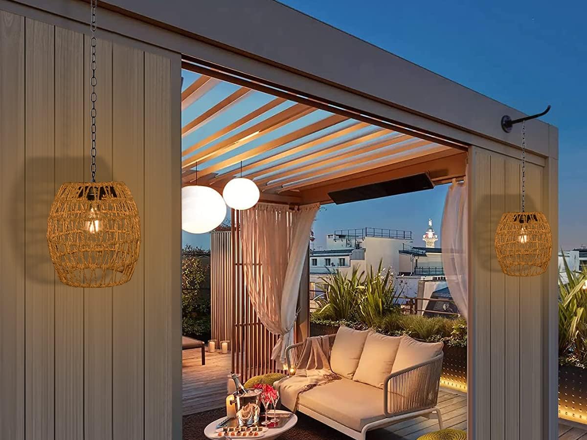 Livinlarge Boho Pendant Solar Light Rustic Hand-Woven Rattan Chandelier Coastal Retro Lamp Wedding Garden Courtyard Hallway Entryway Decoration.