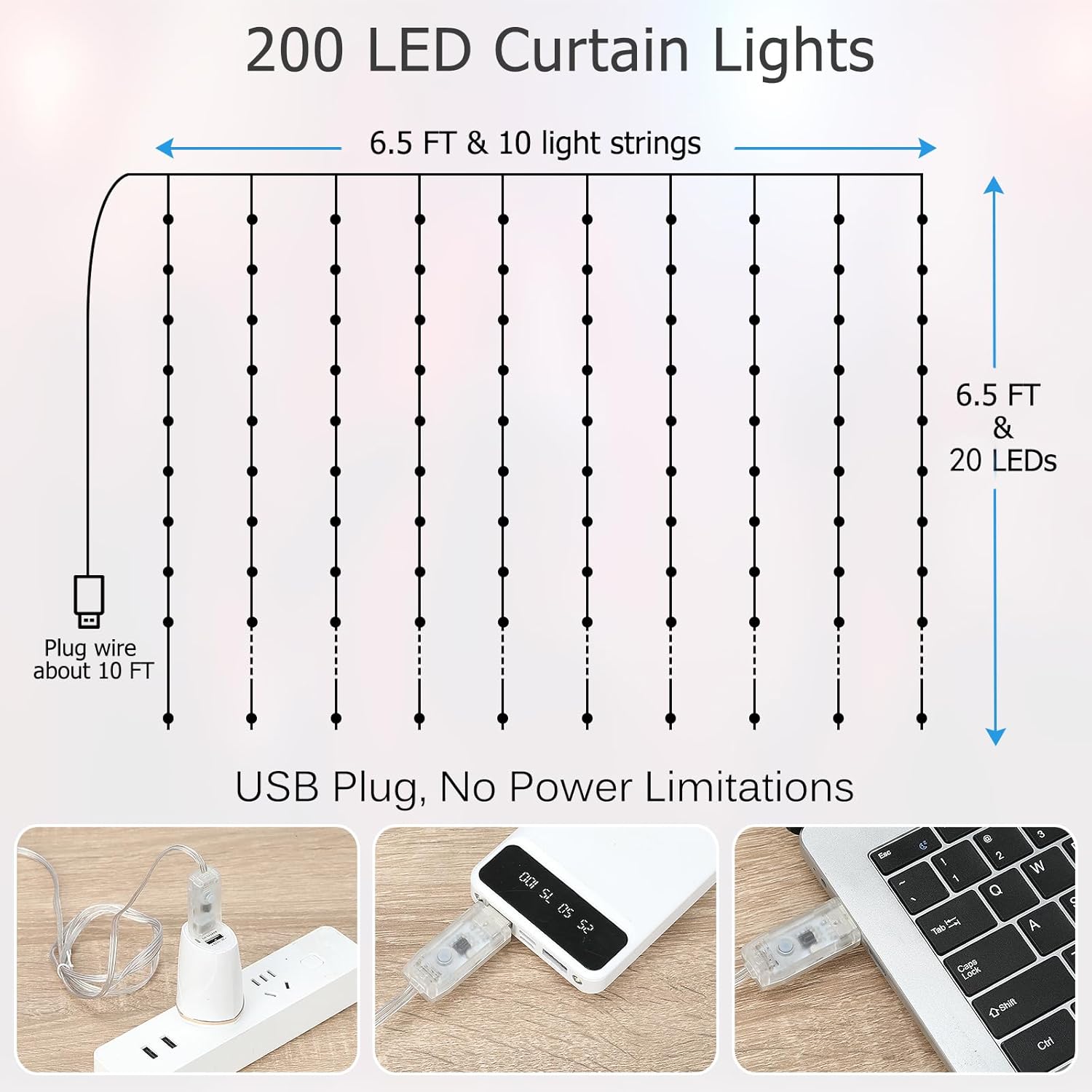 - Safe & Easy to Install: USB power means you can use window curtain lights anywhere, indoors and outdoors,plug in various USB power output device,such as USB charger, powerbank, laptop etc; With 10 equipped hooks, simple to hang it on any surface.