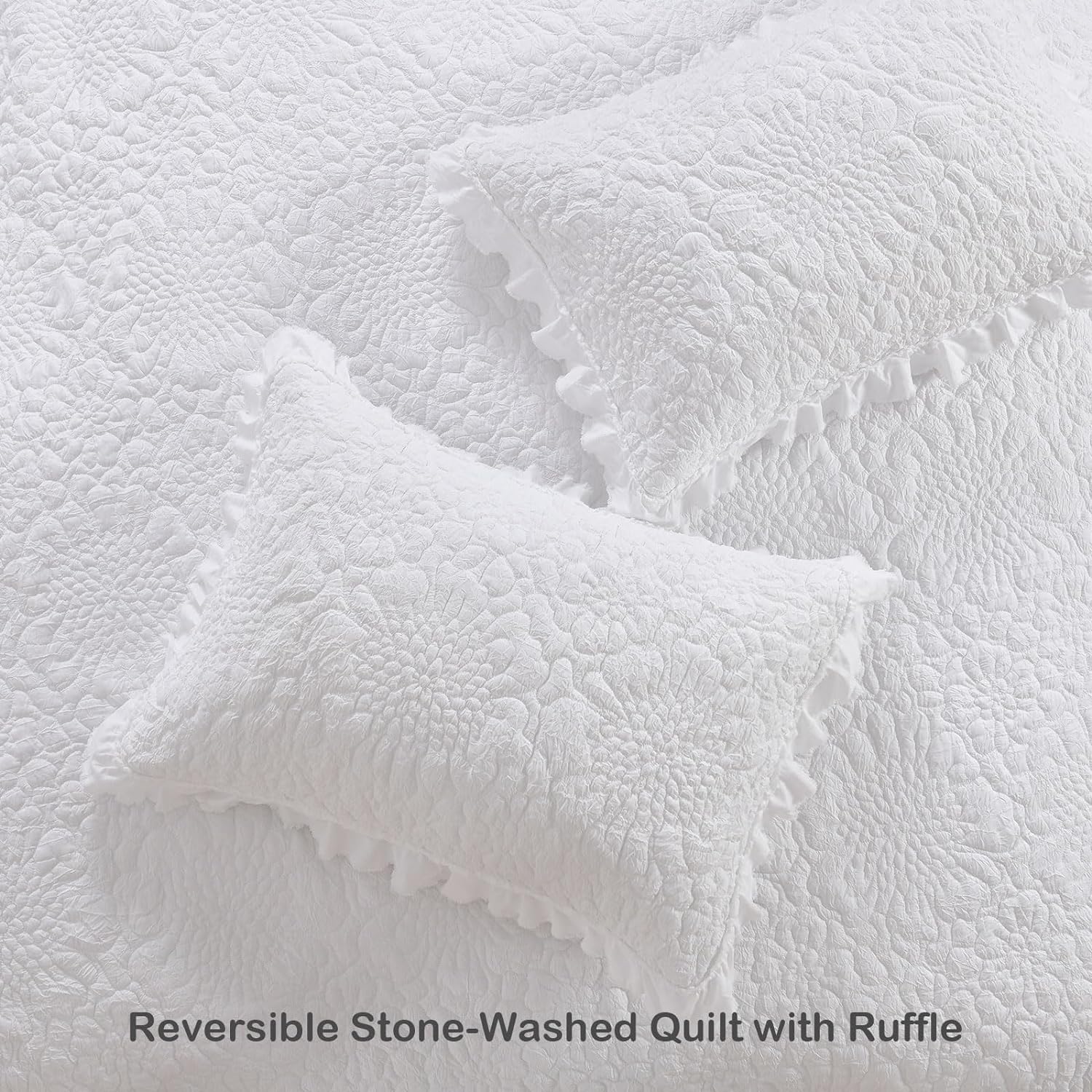 HORIMOTE HOME White Ruffled Quilt King Size, Stone-Washed Microfiber Lightweight Crinkled Farmhouse Rustic Shabby Chic Bedding Set, 3 Pieces Reversible Bedspread with Pillow Shams for All Season