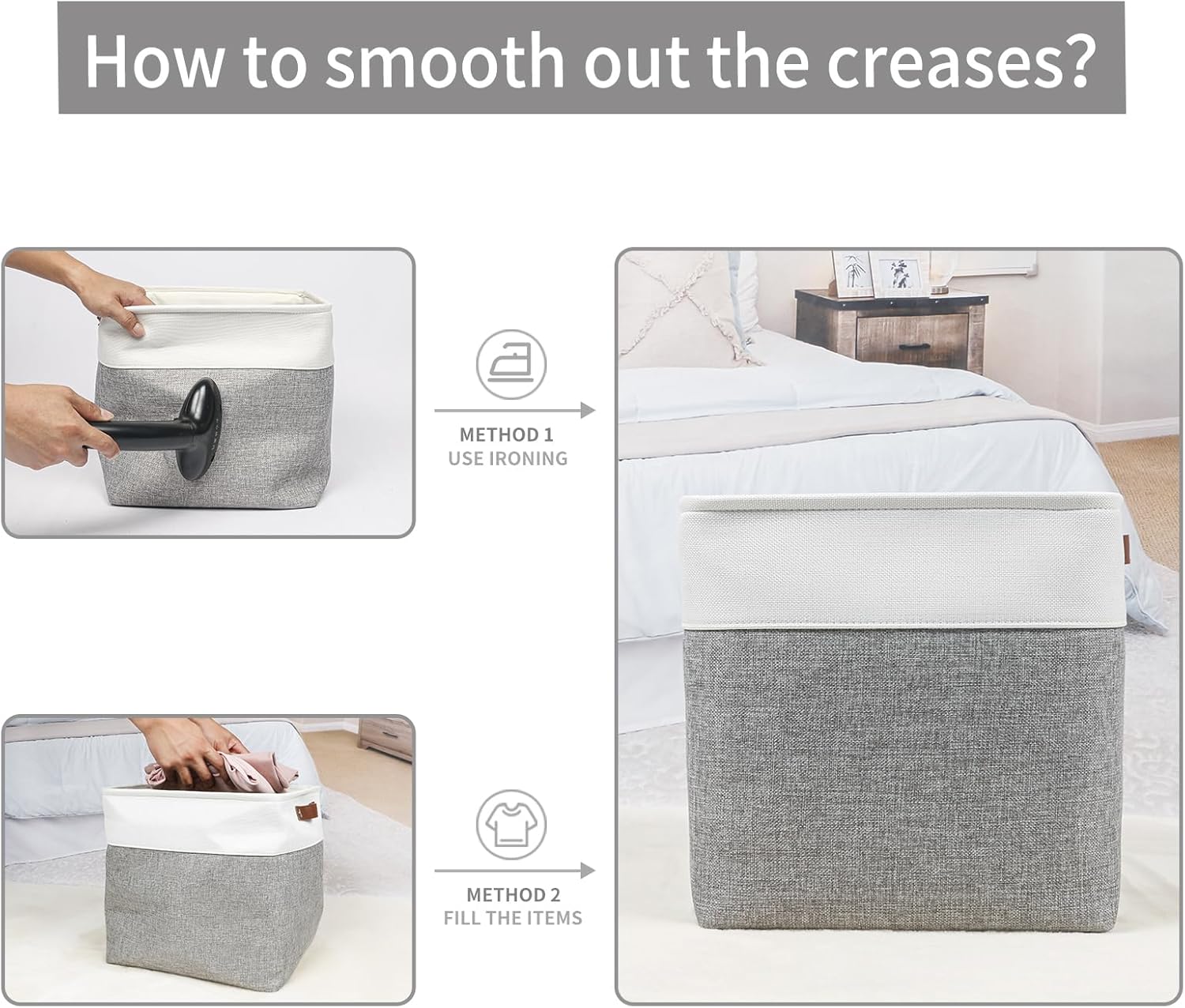 • 【Maintenance & Care Tip】 - Collapsible design for space saving. Our foldable baskets comes in a compression packing which may result in wrinkled storage bin during the long transit. Get rid of the wrinkles by either stuffing the fabric storage bins with blankets and pillows for a few days or steam iron them at low-heat setting. The organization baskets are easy to clean, you can dust the basket with a soft cloth with light soapy water when needed. Not recommended to machine wash.
