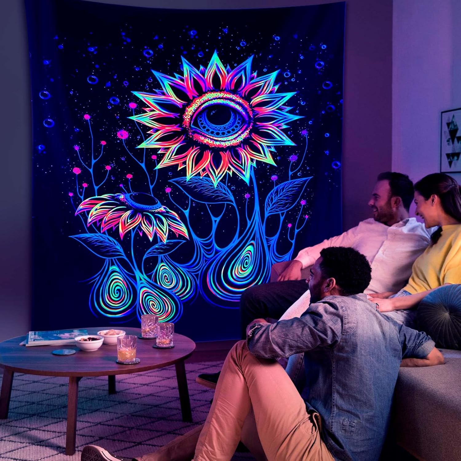 ADDWel Blacklight Sunflower Tapestry, Hippie Eye Tapestry Glow In The Dark, UV Reactive Black Light Upright Posters Wall Hanging for Bedroom Dorm Living Room Backdrop Decor