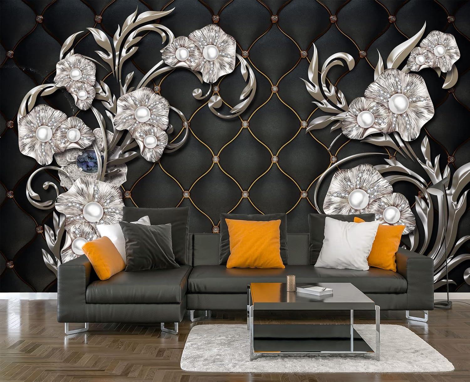 Black Hard Wrapped Pearl Embossed Flowers Wall Mural Wallpaper for Bedroom 103" x 69"