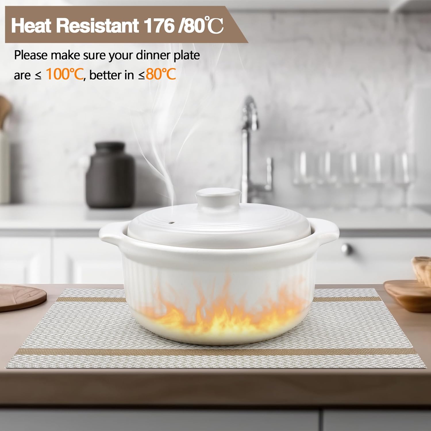- Heat Resistant: Please make sure your dinner plate are ⤠100â, better in â¤80â. It can prevent the table from slipping and scalding the countertop. These beautiful stylish vinyl place mats to add more fun to your dining table
