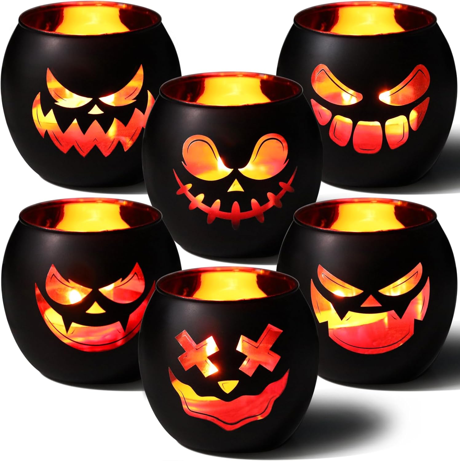 Black Halloween Table Centerpieces Candle Holders 6PCS, Jack O Lantern Tealight Votive Candle Holders, Indoor Halloween Decorations for Mantel Coffe Table Decor