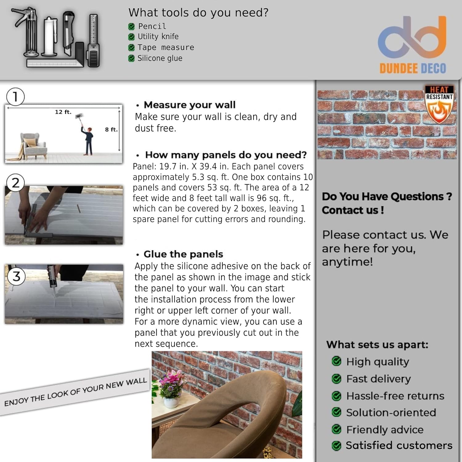 - Covers More Wall in Less Time. Each 3D panel measures 39.4" x 19.7" x 0.80", with a 10-pack covering 53 sq. ft. (for standard height walls, 6 feet wide). Larger size means fewer pieces and quicker installation. Note: Sample panels are 10" x 10".