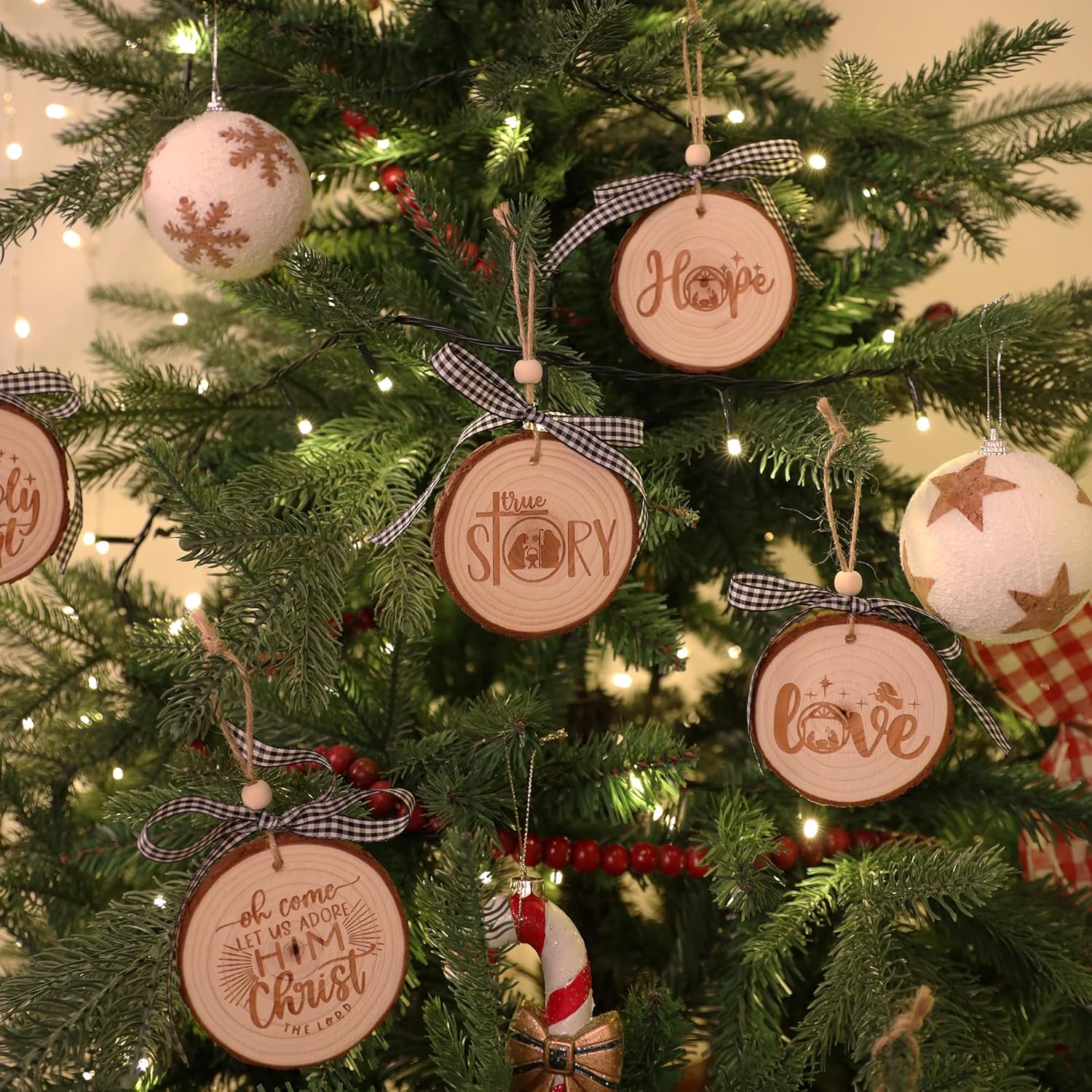 - Premium craftsmanship:Made from 9mm natural wood slices, the surface is smooth. Double-sided engraving. Comes with black and white buffalo plaid as well as red and black buffalo plaid ribbons. You can choose the ribbon color according to your Christmas decoration theme. Each ornament is already equipped with rope.