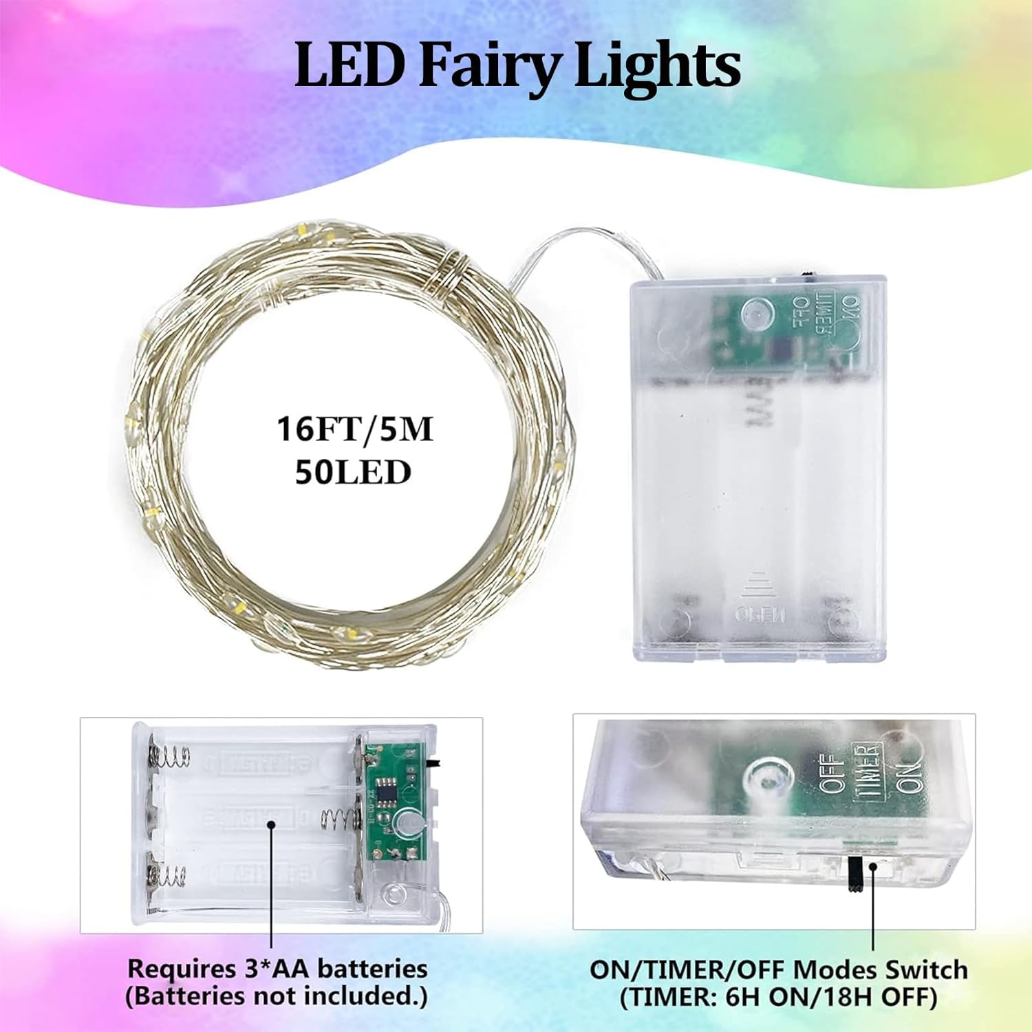 - Ultra-Bright and Durable Battery Fairy Lights: Designed with ultra-bright LEDs and durable silver wire, these battery-operated lights are built to last and make an excellent choice for decorating bedrooms, centerpieces, balconies, decks, and porches. Each set includes 4 strands of lights, each 16ft long with 50 LEDs, powered by 3 AA batteries (not included)