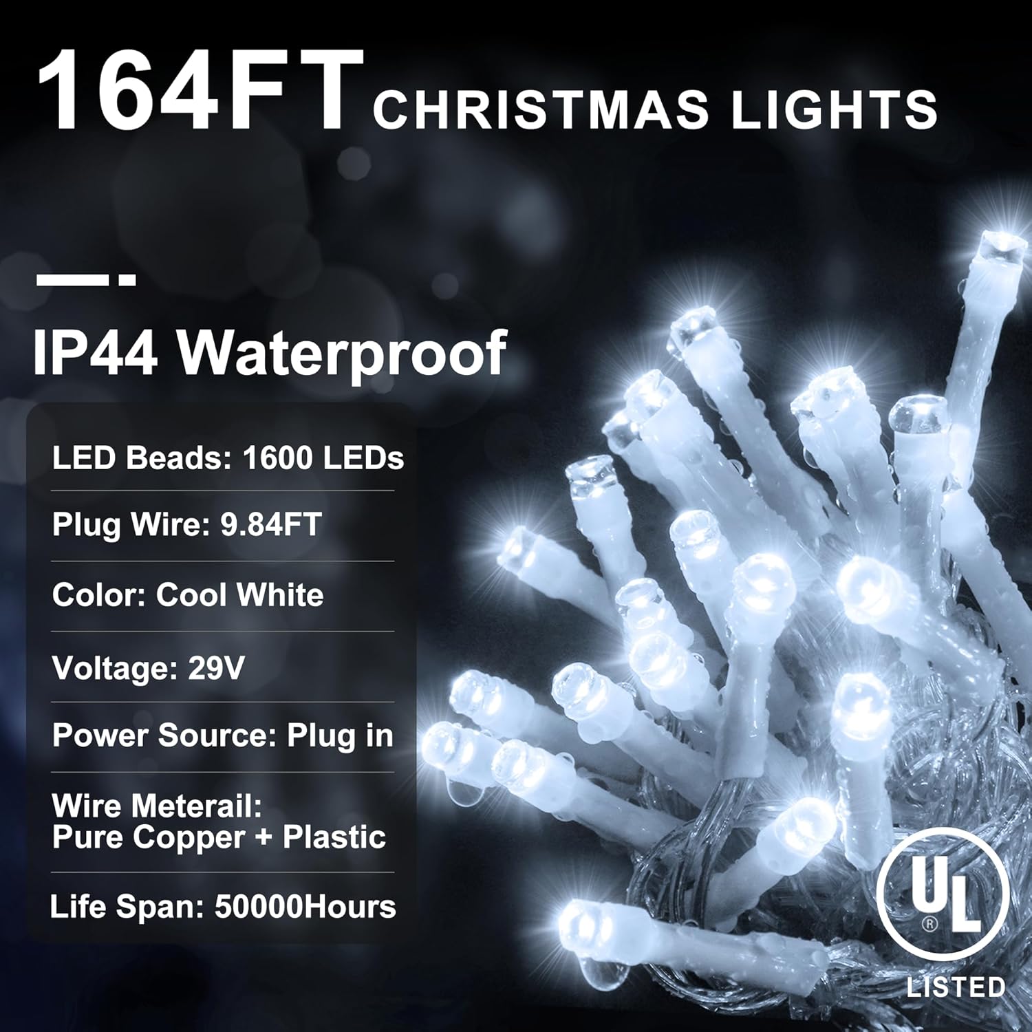 KNONEW 164FT 1600 LED Christmas Lights Outdoor Decoration White Timer 8Modes Hanging Fairy String Lights with 320 Drops, Plug in Waterproof Indoor Decor for Holiday Wedding Party Window Garden