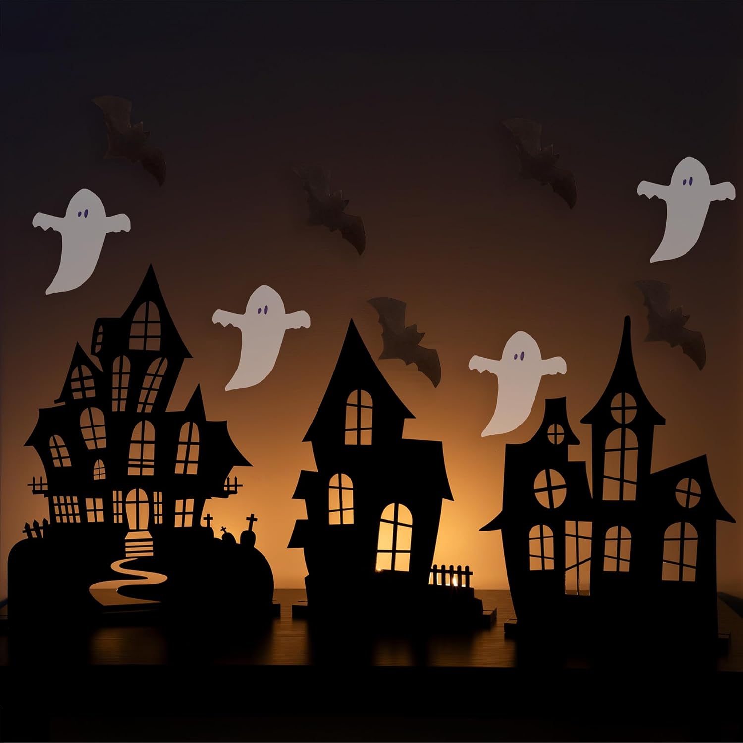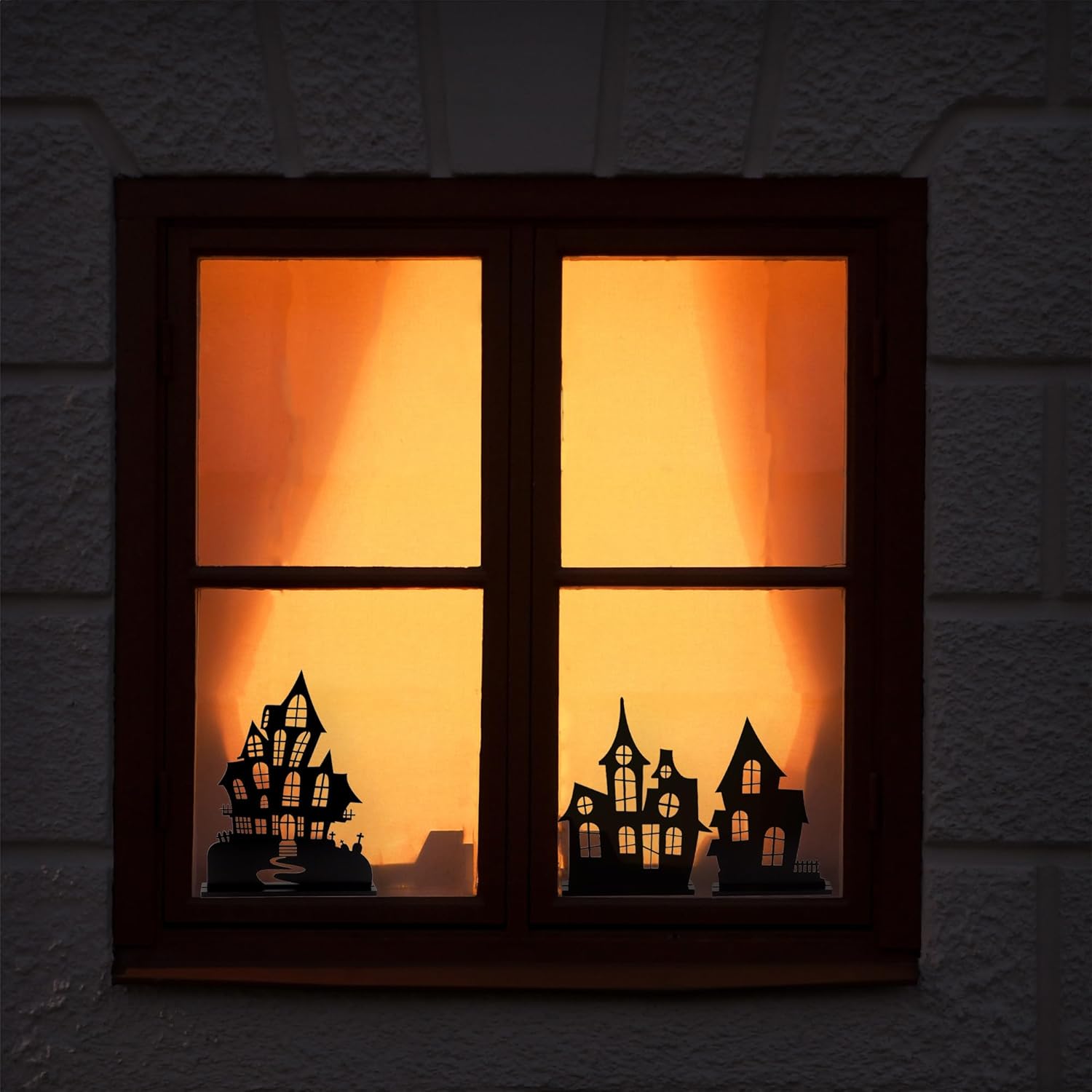 - SET OF 3: Receive 3 spooky wooden house silhouettes each with a wooden base