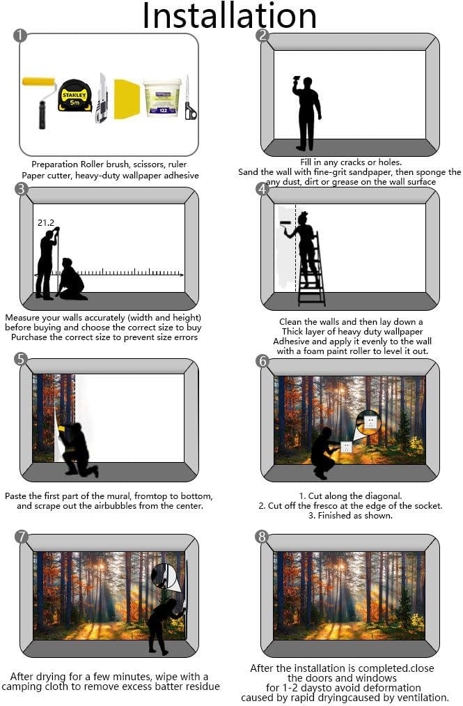 - Installation steps 1. Fill in any cracks or holes and clean the surface of the wall of dust, dirt and grease.2. Apply heavy-duty wallpaper paste to the wall, not the mural.3. Mark the position of each strip of wallpaper with a spirit level.4. Align the pattern and slide it into place.5. Scrape the bubbles with a spatula.6. Let it dry for a couple of minutes and it's ready to go!