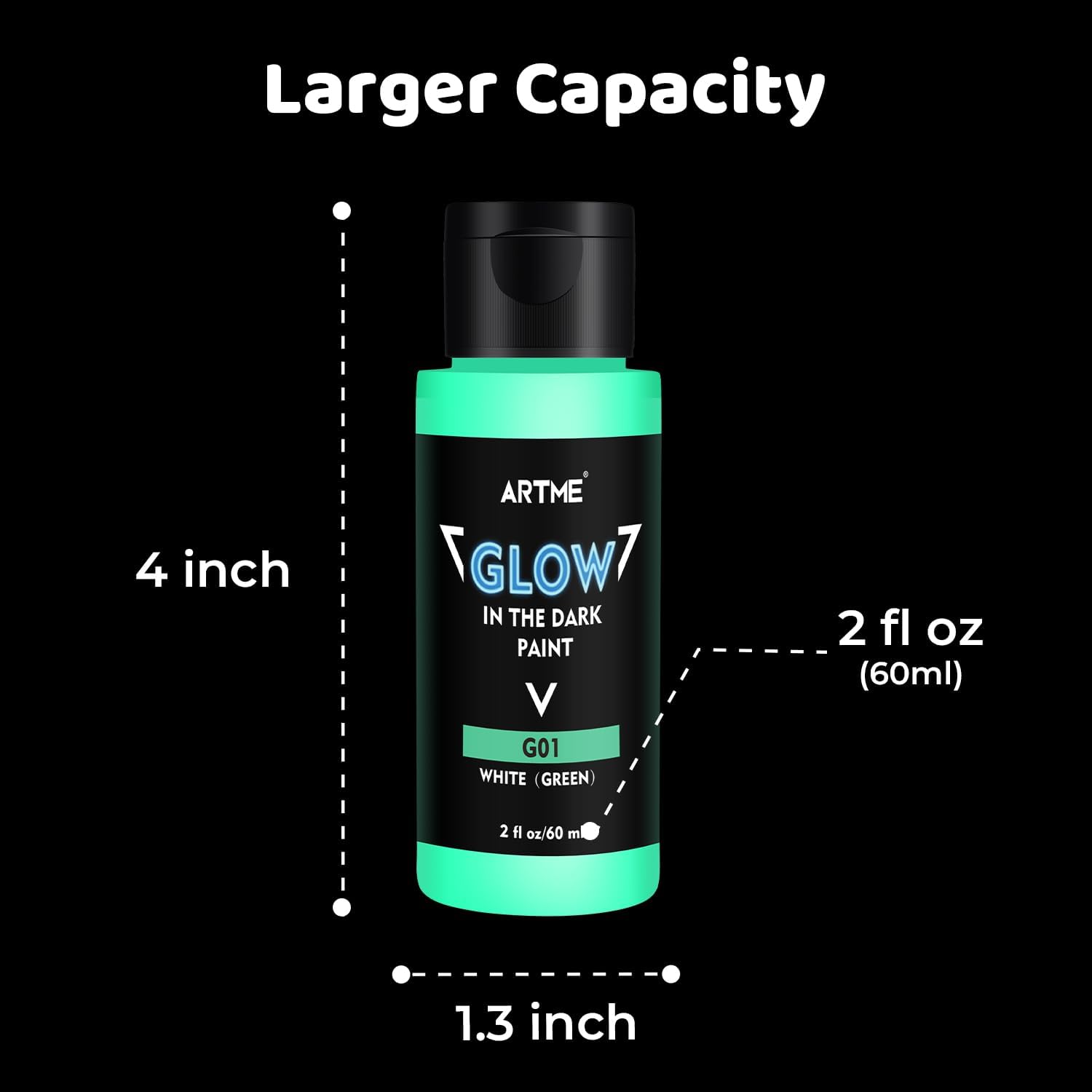 - HIGH-QUALITY GLOW PAINTS: ARTME glow in the dark paint uses high-quality pigments, has great light fastness, and a gloss finish to ensure that each color will glow for hours after absorbing light under light sources. It is recommended to be used with black light or LED light for better effect.