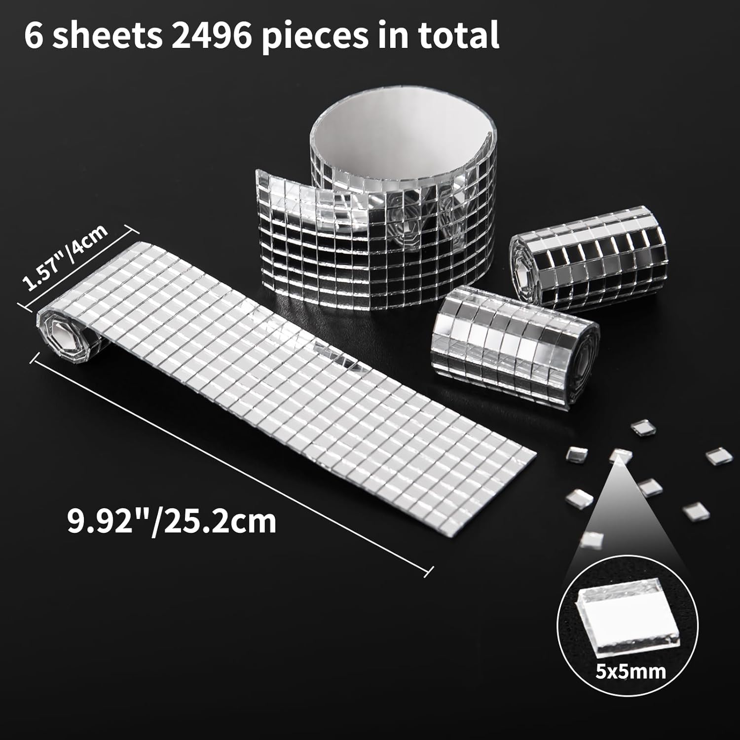 - What You Get: 6 sheets mosaic silver mirror tiles in a box, 2496 pieces in total. Each mirror tiles is 25.2x4 cm (9.92x1.57 inch).
