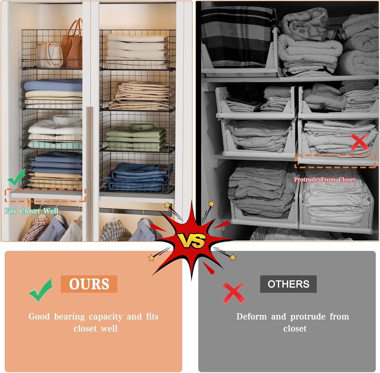 - 【Stackabe and Foldable】These collapsible closet shelves organizer are stackable and foldable.And can fold them to put in a corner without taking up space.You can stack multiple units together or use only one to meet your different needs.