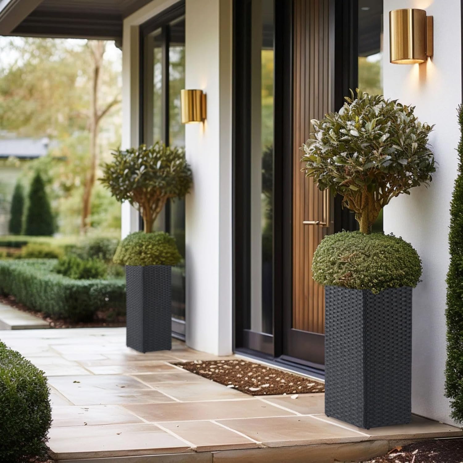 SUNNYPARK 2 Pack Tall Planters for Outdoor Plants Rattan Modern Tall Square Planter Box with Removable Liners Indoor Outdoor Porch Patio Flower Pot (12’’ x 12’’ x 24’’)
