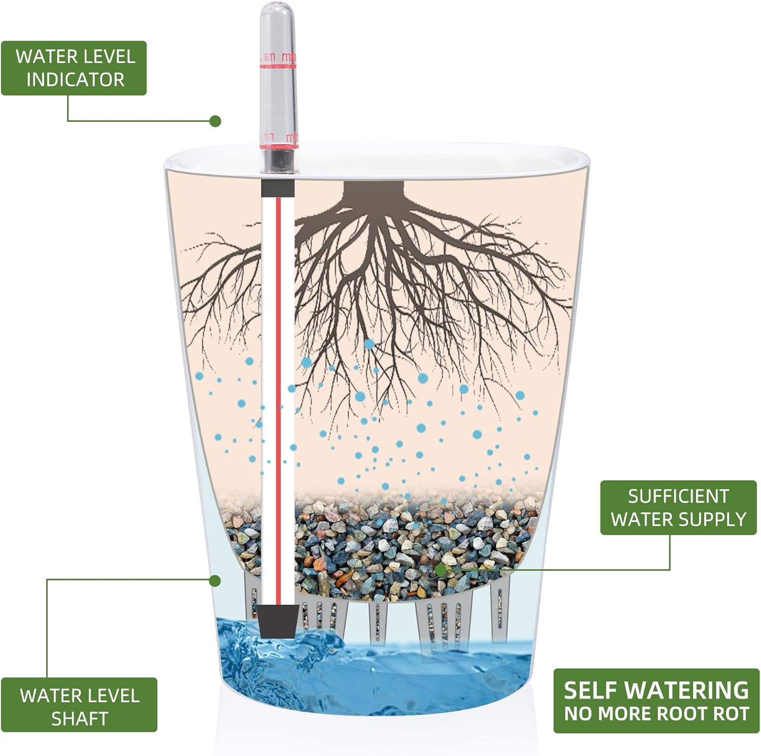 - NEVER MISS WATERING AGAIN - The hydroponic device keeps water ready, then watering time is at your discretion on the gauge. The design of drainage plug and spillway hole is to avoid cycles of overwatering and underwatering, pull out the plug to drain the excess water on rainy days outdoors. The sufficient water supply system enables double the water-efficient than conventional pots. Don't be anxious about missing watering while you enjoy a long term holiday on a journey or travel outside