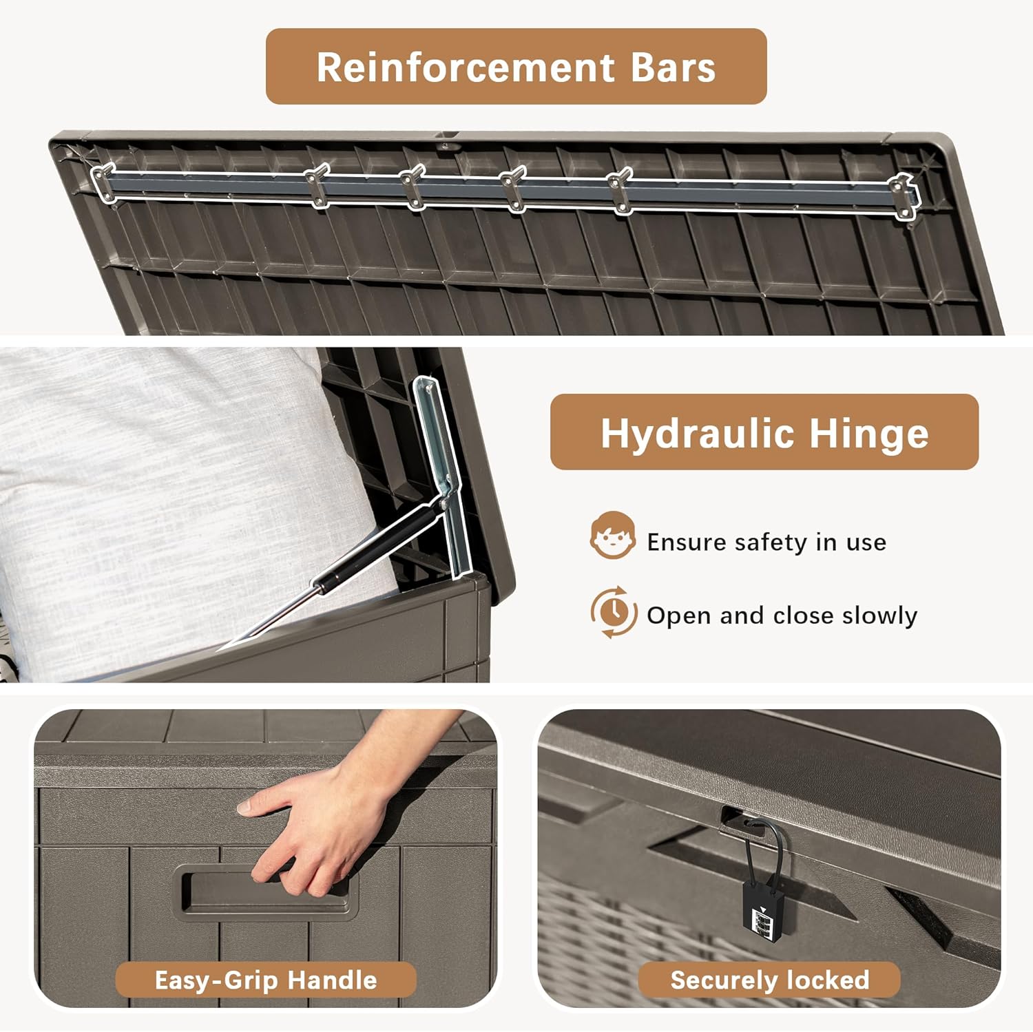 - Clever Function Design: Patio storage box features handles on both sides for easy mobility. The hydraulic hinge design prevents pinching and ensures safety. It also comes with a lockable lid for added security. Furthermore, it can be used as a two-person seating bench