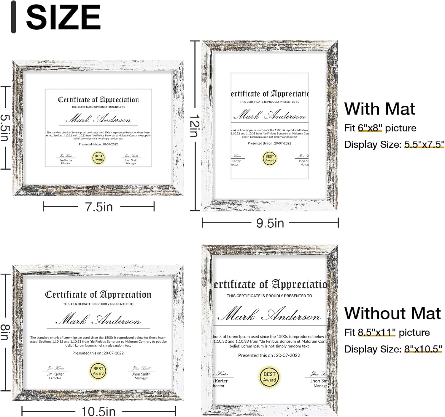 Vittanly 8.5x11 Picture Frames Set of 9, Shatter Resistant Plexiglass, Display 6x8 Pictures with Mat or 8.5x11 without Mat, Photo Frames for Wall or Tabletop, Engineered Wood, Distressed White