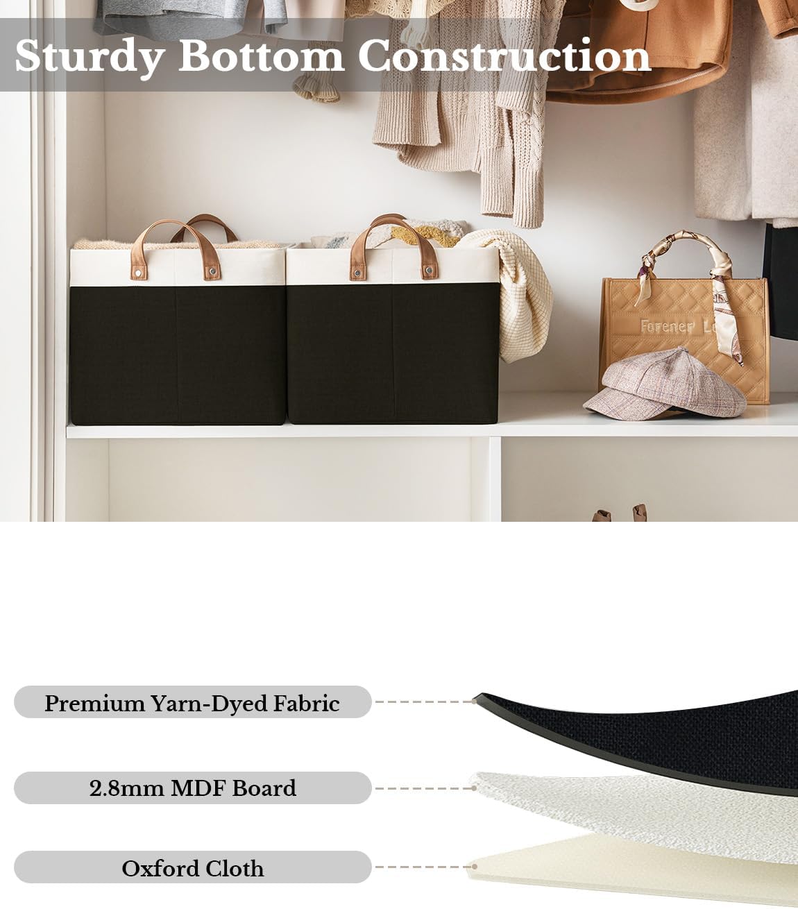 • Premium Quality: Made from high-quality fabric and reinforced with a heavy-duty MDF bottom board and a sturdy metal frame. The solid construction enables the storage bins to stand upright without support, even when empty.
