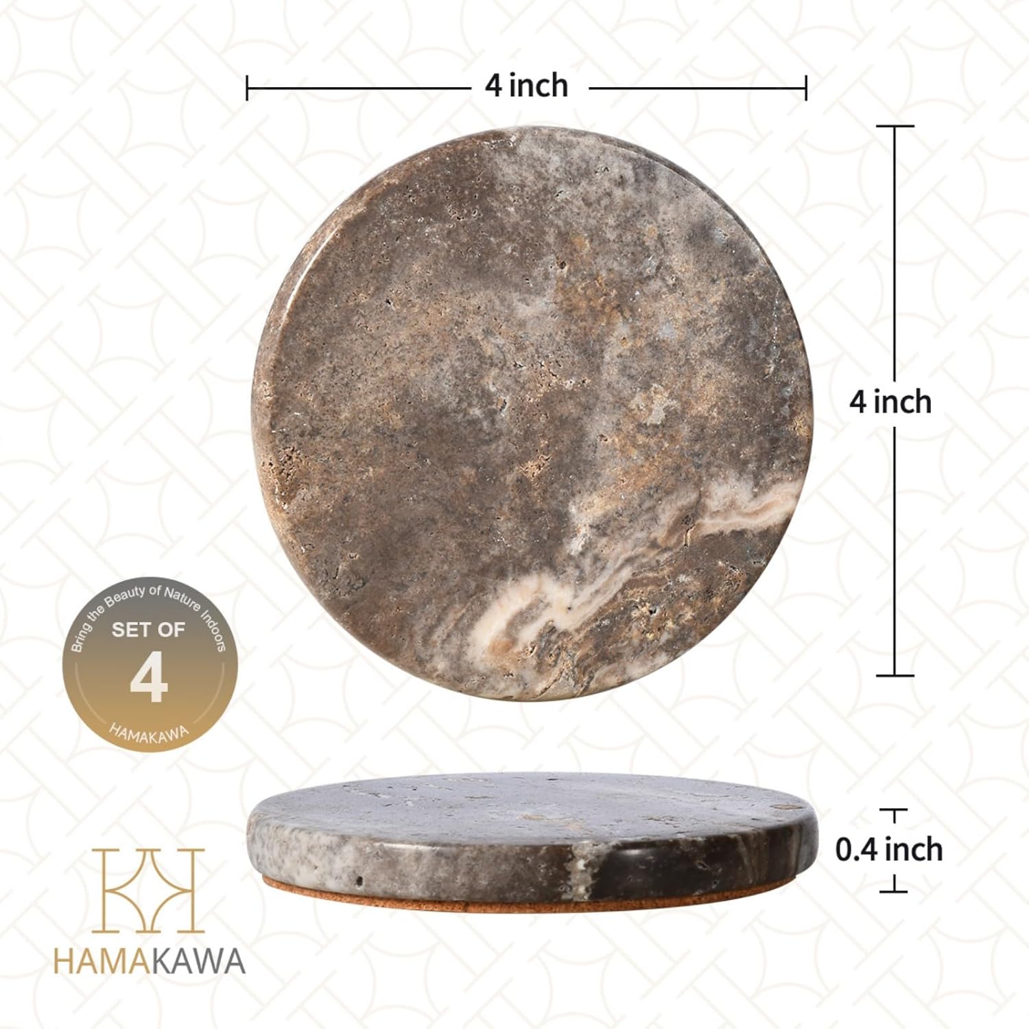 Marble Coasters Set of 4, Natural Gray Stone 4 Inch/10 cm, Modern Round Travertine Drink Coasters for Home Decor, Coffee Table, Office