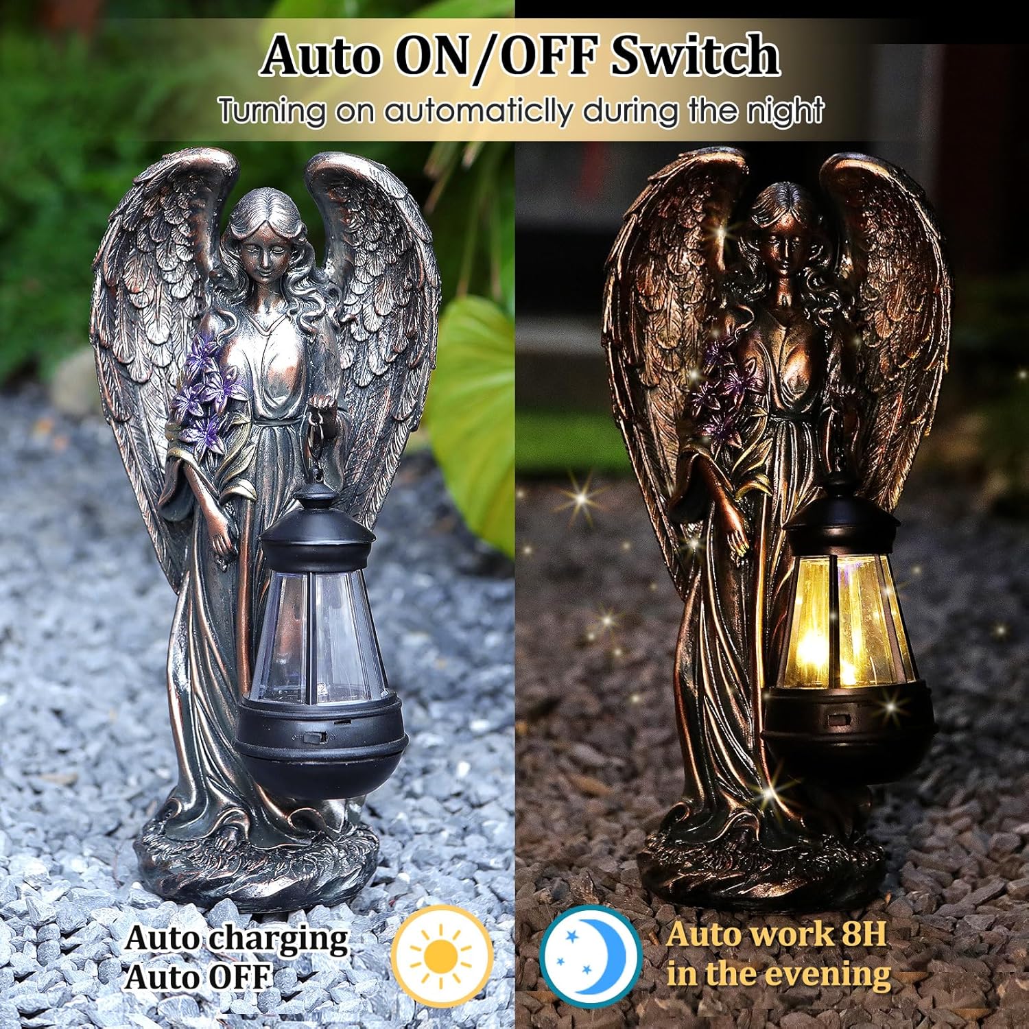- 【Build your Modern Garden】Our Bronze angel stands at 13.2 in making them the perfect size to add a touch of whimsy to any outdoor space. simulate watering effect, This yard solar angel statue brings color and life to your home as it shines in the sunlight and light up in your garden at night, which can cerate an environment full of whimsy and magic!