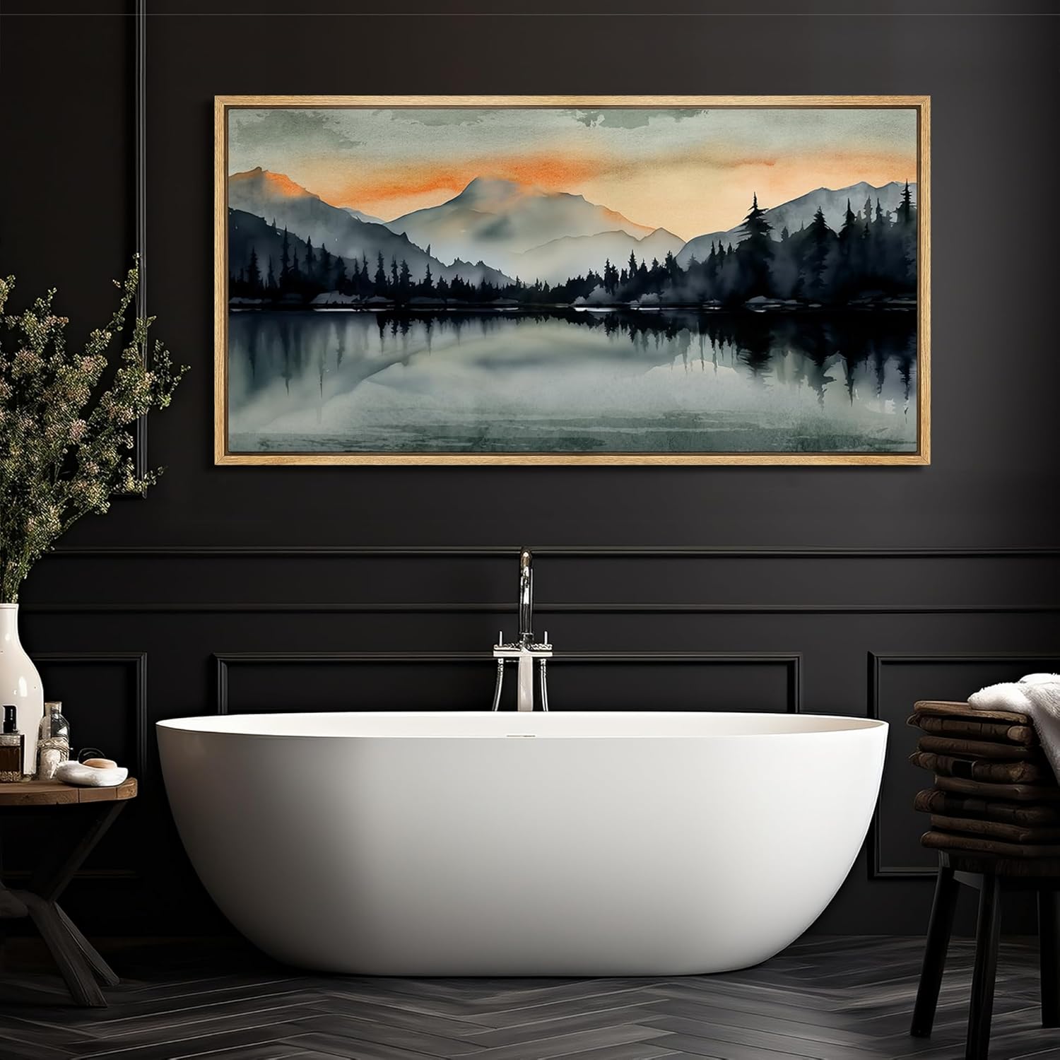 MUDECOR Extra Large Framed Canvas Print Wall Art Sunset Mountain Range and Lake Panoramic Antique Retro Fine Art Illustrations Decorative Colorful for Bedroom - 60"x30"