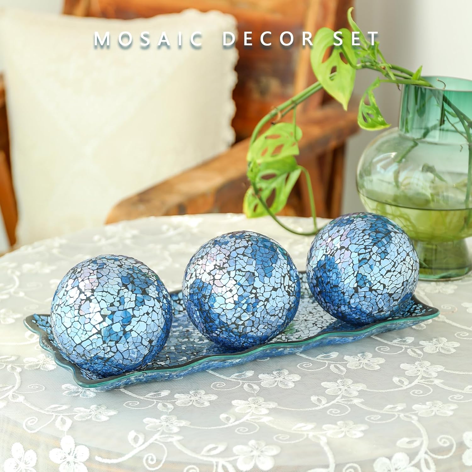 VCUTEKA Decorative Balls and Glass Bowl, 4 Inch Mosaic Sphere Balls Centerpiece Balls for Coffee Table, Home Decor, Wedding Party Decor, Blue