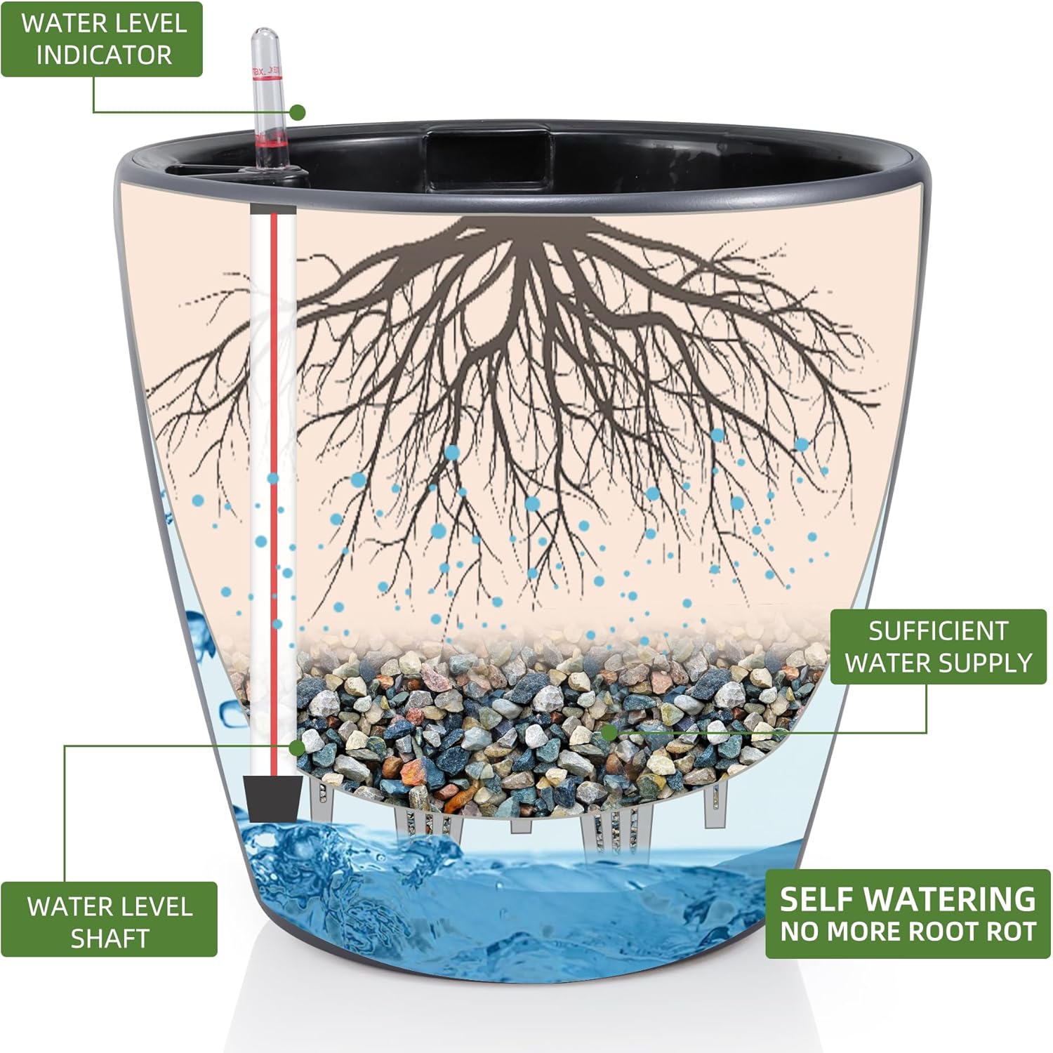 - NEVER MISS WATERING AGAIN - The hydroponic device keeps water ready, then watering time is at your discretion on the gauge. The design of drainage plug and spillway hole is to avoid cycles of overwatering and underwatering, pull out the plug to drain the excess water on rainy days outdoors. The sufficient water supply system enables double the water-efficient than conventional pots. Don't be anxious about missing watering while you enjoy a long term holiday on a journey or travel outside