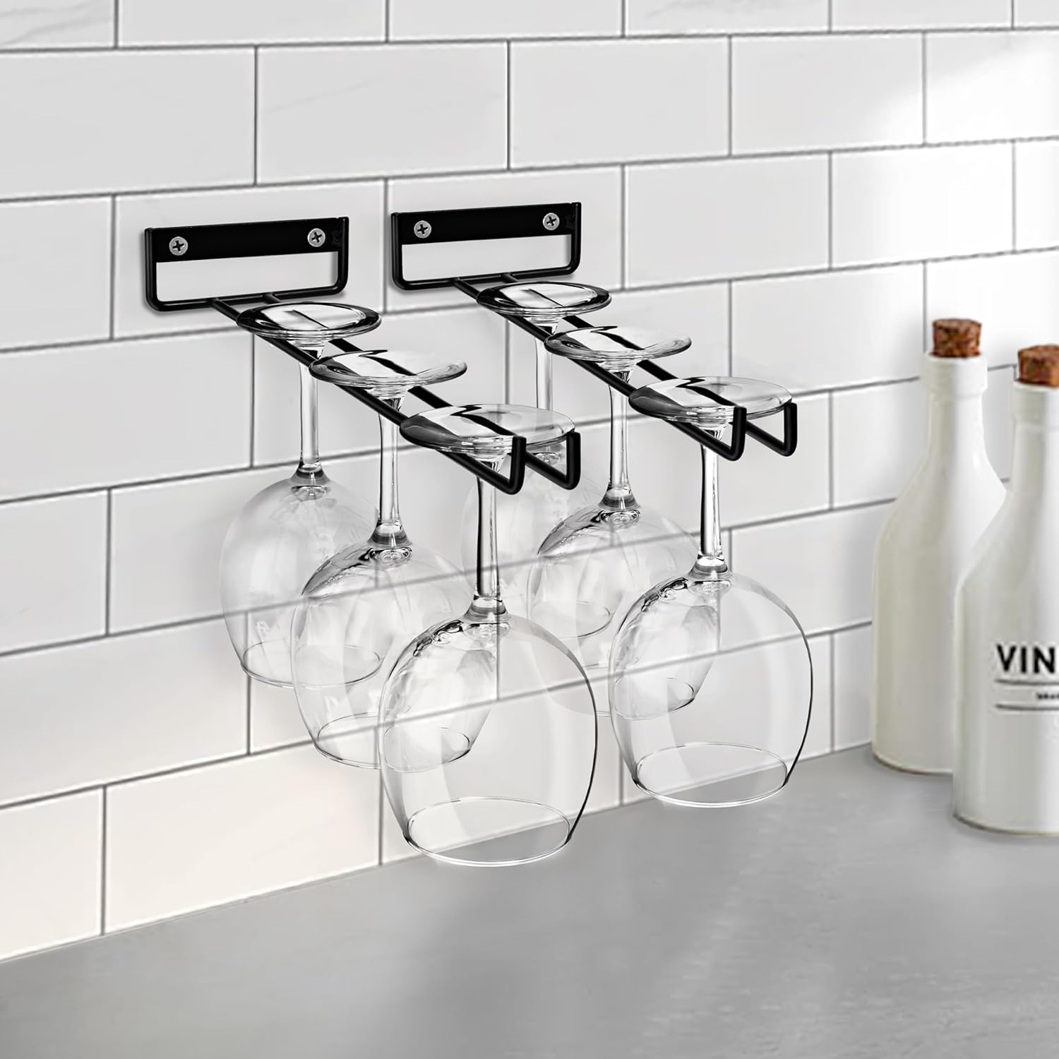 - Under Cabinet Wine Glass Rack (4 Pack): Mounts directly under cupboard for visible storage of your glassware - Stores 3 of your favorite stemmed wine glasses or 4 champagne glasses per rack depending on the size - Can also be used as a mug shelf for mug storage - Use display shelf to organize your choice of glassware, china storage, bar wall decor, wine glass storage, and more