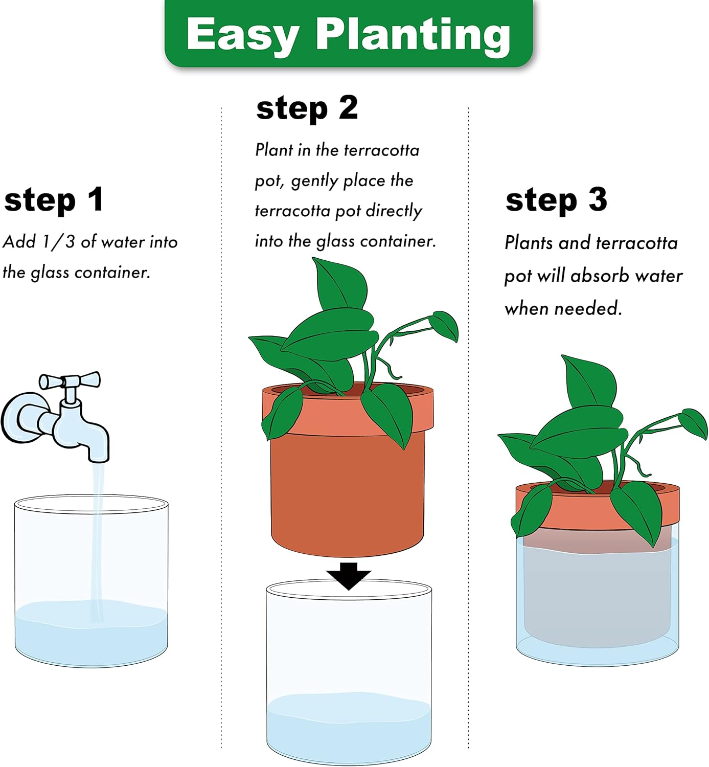 - Self-watering System: The terracotta pot is unglazed, just fill the glass container with water to ensure plants will absorb only what they need through the terracotta pot walls.