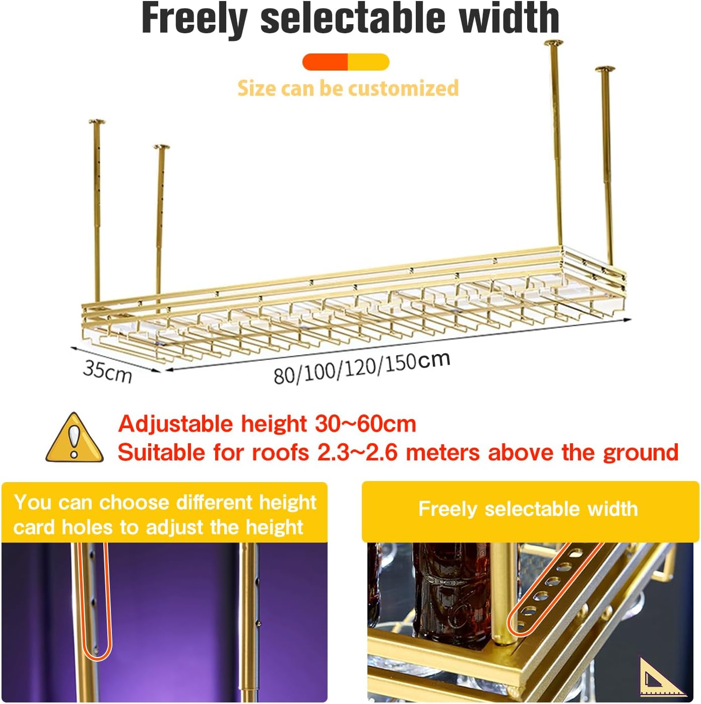 - 2 Colors, 4 Sizes: Color: Black, Gold; Size: 31.5''x13.8'', 39.4''x13.8'', 47''x13.8''. Wine glass storage display rack, can be used for glass holders of champagne glasses, white wine glasses, sparkling wine glasses and champagne flutes