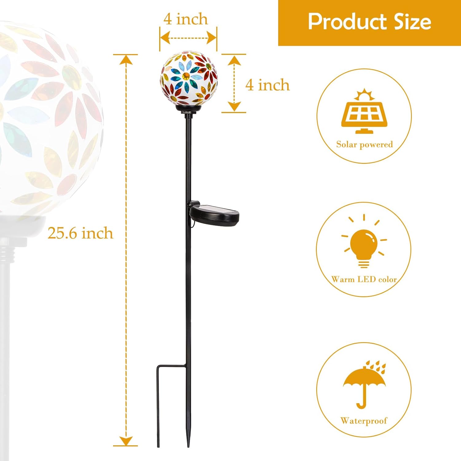 - ★Unique design: Solar garden lights add fun to your garden, patio or pathway. Artistry mosaic ball can reflect light via crackle-like glass from every angle under the sun.