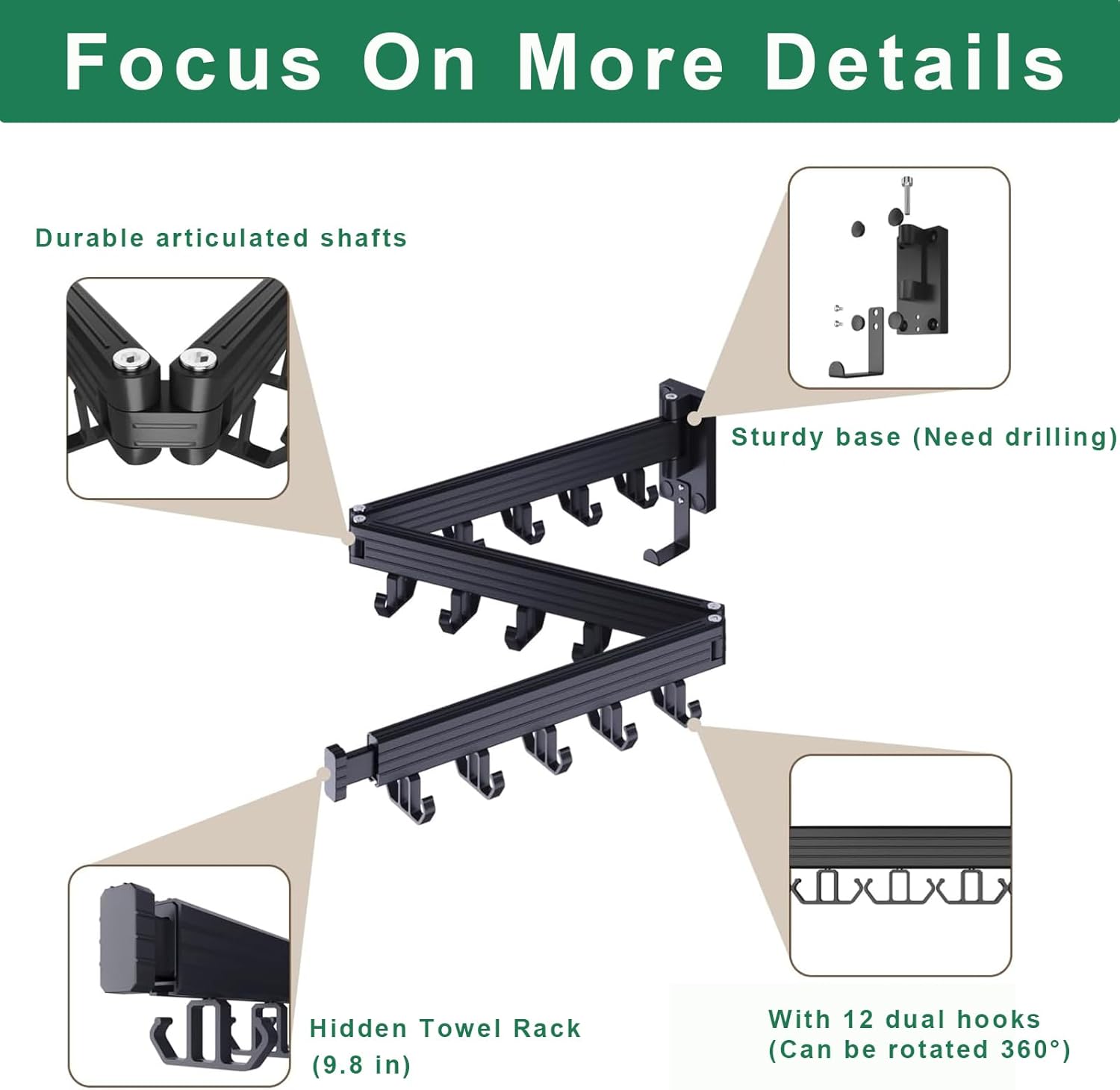 - ā Upgrade Dual-J-Shape Hooks Design -- Our clothes drying rack features an innovative design with 12 dual J-shaped & circular hooks, providing you with versatile hanging options. The additional large hooks and extendable rods make it easy to hang a variety of items with ease. Maybe you will fancy this wall-mounted clothes rack, as it brings convenience and efficiency to your daily life.