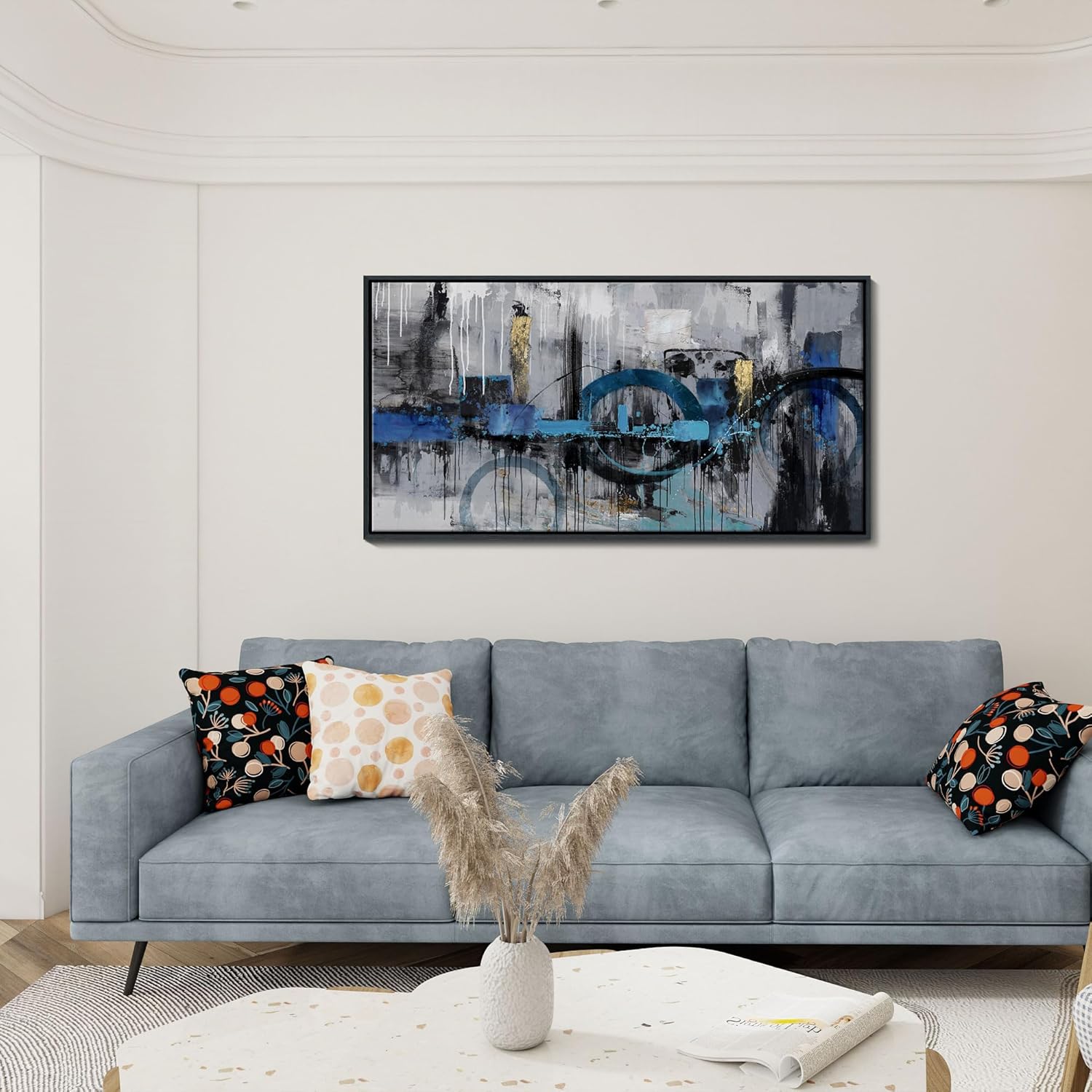 KLAKLA Blue and Gray Abstract Canvas Wall Art - Lnk Style Gold City Scenes Wall Decor Living Room Bedroom Decoration Black Frame Picture Artwork for Wall Modern Landscape Wall Decor