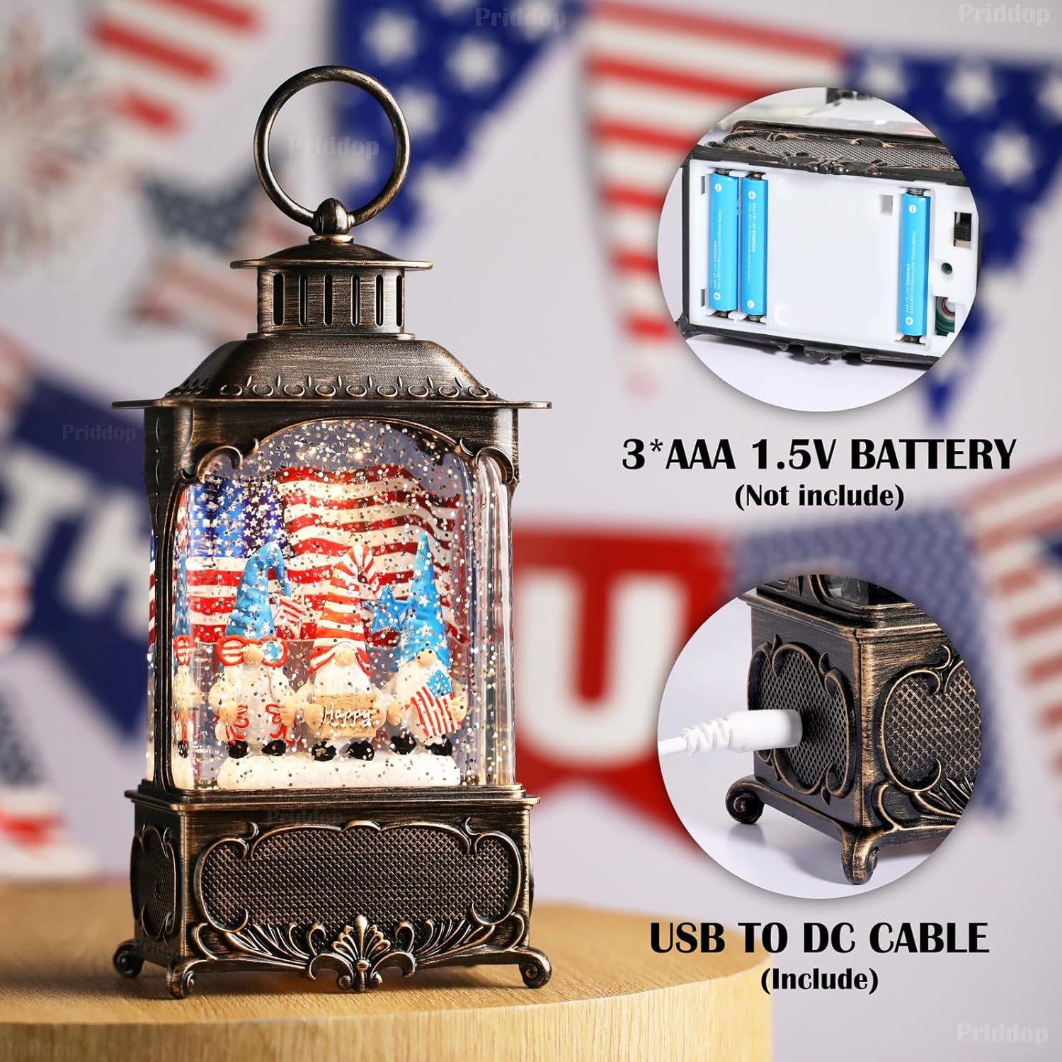 - Gnome Snow Globe: The lantern has three gonme wearing 4th of July shirts, with the American flag. Add some joyful atmosphere to your 4th of July.
