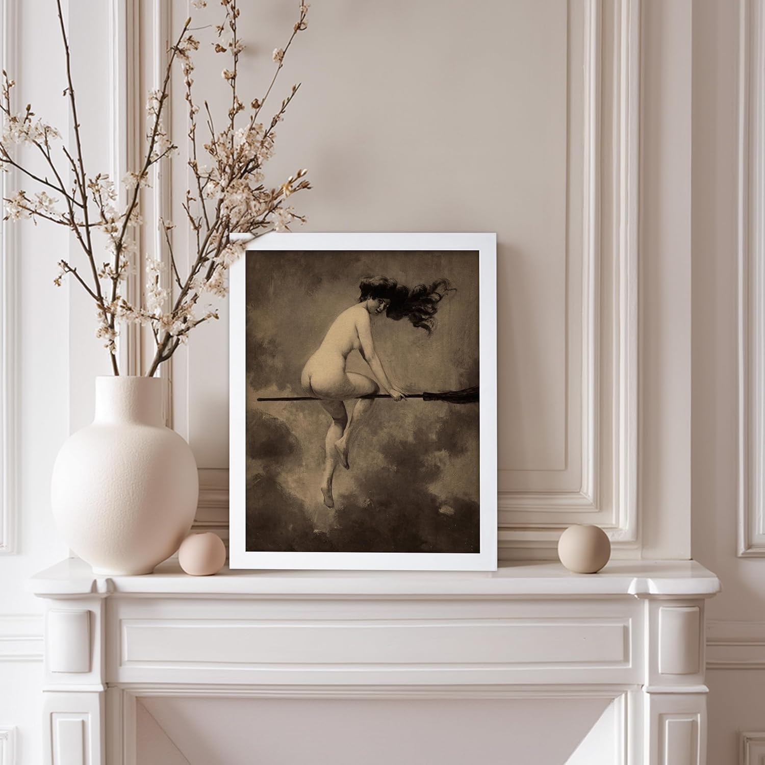 Poster Master Vintage Albert Joseph Penot Poster - Retro Halloween Print - Gift for Artist, Friend - Departure for the Sabbath, Naked Witch on Broom - Wall Decor for Bedroom, 11x14 White Framed