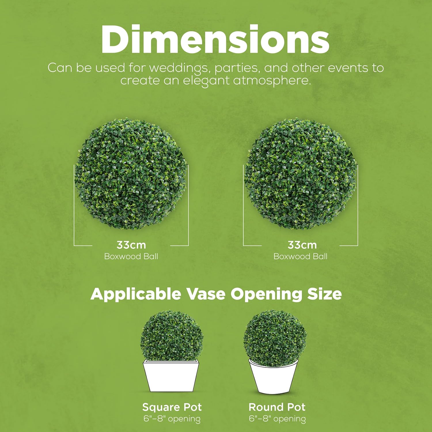 - VERSATILE DECORATIONS – Enhance any space with our high-density, faux boxwood balls. Perfect for the home, porch, or garden, they add low-maintenance greenery anywhere. Each measures about 13” in diameter.