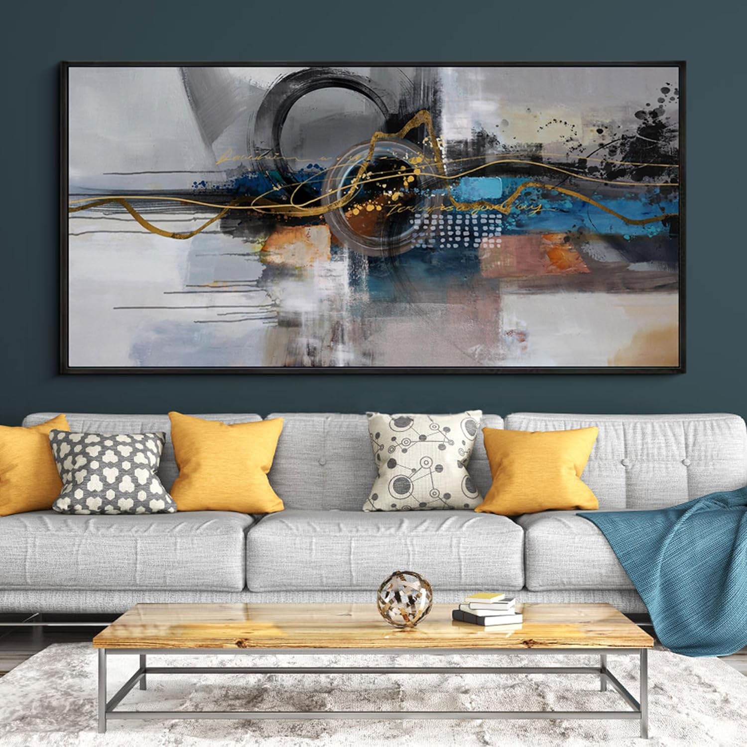 XLSJERST Large Abstract Frame Wall Art - Black and Blue Cnavas Framed Artwork for Walls Modern Minimalist Boho Gray Pictures Wall Decor for Living Room Bedroom Office Home Decoration 29x58 Inches