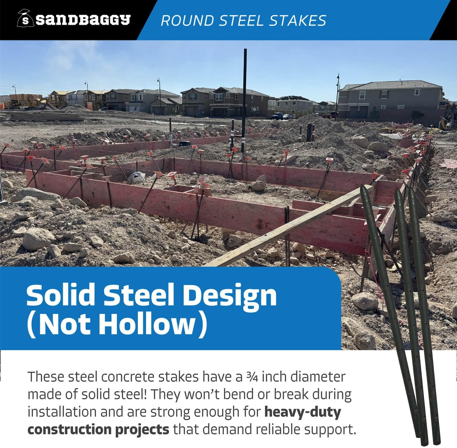 - SOLID STEEL DESIGN (NOT HOLLOW): These steel concrete stakes have a ΒΎ inch diameter made of solid steel! They wonβt bend or break during installation and are strong enough for heavy-duty construction projects that demand reliable support.