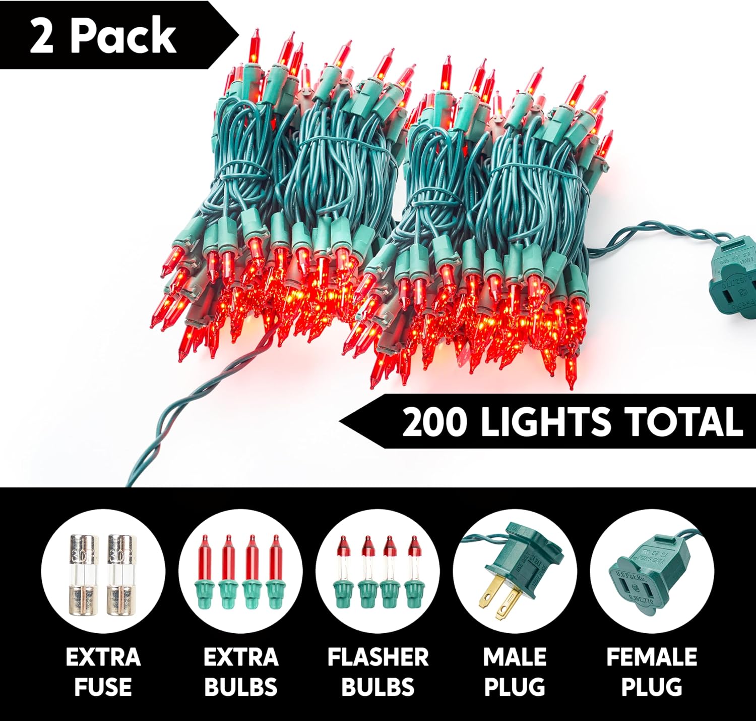 - Super Value Pack. Our Halloween incandescent string lights have a total of 200 incandescent red T5 bulbs with green wire, 100 Incandescent each. 40.8W 120V. Total Lighted Length is 43Feet, 19.4 Feet each. Total Wired Length is 42.8 Feet, 21.4 Feet each. Bulb Spacing 2.36 inches. High Voltage.