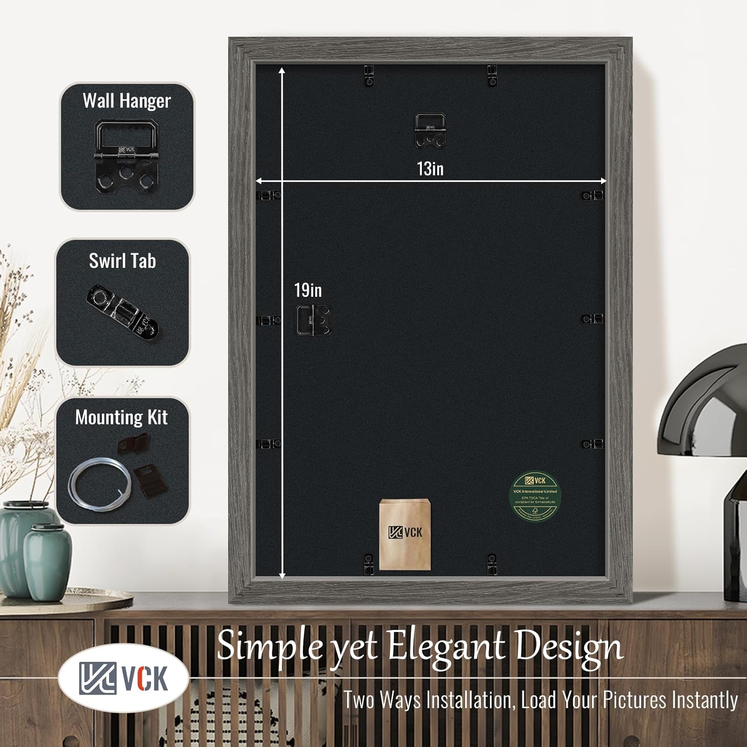 - Effortless Installation: Our grey picture frame not only comes with hanging hardware for both horizontal and vertical display, but also features a unique spin-lock design. Allows for easy loading of 13x19 or 19x13 photos, prints, diplomas, puzzles, or art