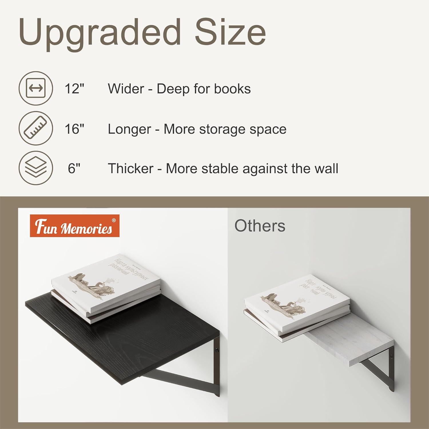 Fun Memories Deep Floating Shelves for Wall, 12 Inch Deep Black Floating Shelves Set of 2, 16" W x 12" D Wall Shelf, Wide Display Ledges Shelves for Bedroom, Bathroom, 12 Deep Bookshelf Wall Mounted